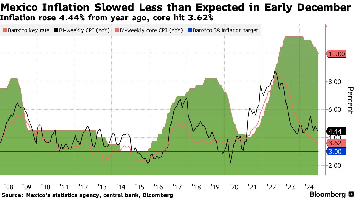 墨西哥的年度通胀在12月初略微放缓,低于预期,因为服务价格持续受到压力,这支持了中央银行在延长降息时的谨慎态度。