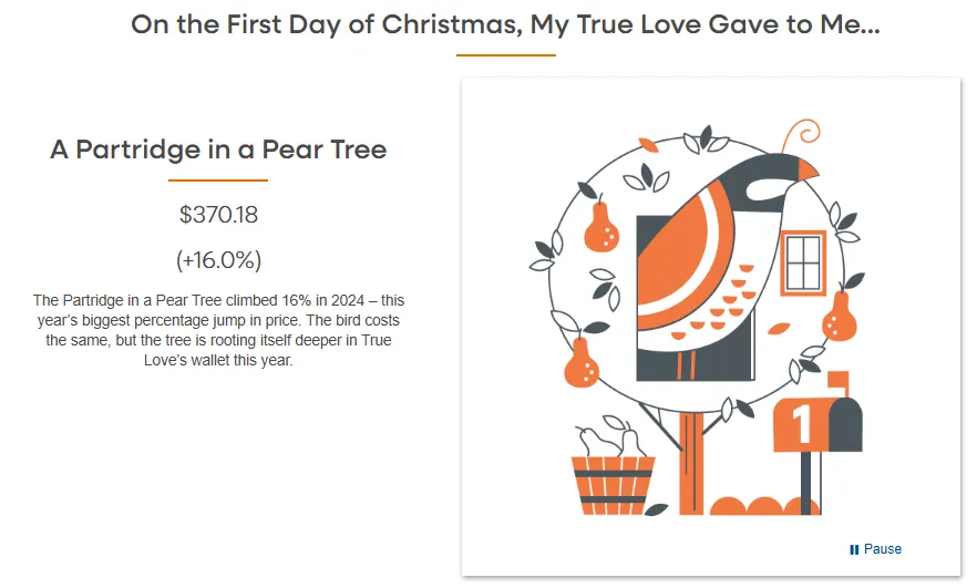 在过去的41年里,匹兹堡的PNC银行一直在进行一项轻松的估算,计算从梨树上的鹧鸪到12个鼓手的完整套餐的成本。PNC的“圣诞价格指数”今年增长了5.4%,是2023年增幅的两倍。熟练劳动力的工资上涨推高了表演者的成本,包括跳舞的女士和吹笛的牧童。