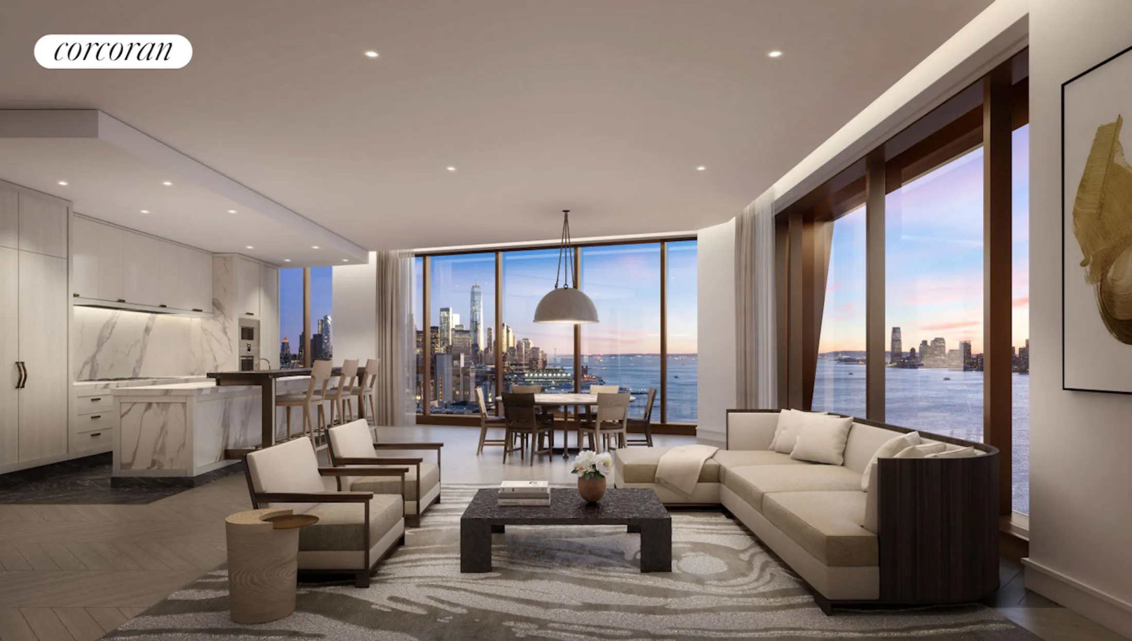 500 West 18th Street 内部的渲染图。来源:Cocoran Group500 W. 18th St., 西顶层公寓 36: 4700万美元 背景故事: 这个顶层公寓位于 One High Line 开发项目的西塔。建筑由明星建筑师 Bjarke Ingels 设计,看起来就像有人从顶部扭动了一座标准的公寓塔,给人一种它们被捕捉在扭转中的印象。根据上市文件,这个整层公寓的面积略低于7000平方英尺,拥有六间卧室和七个半浴室。