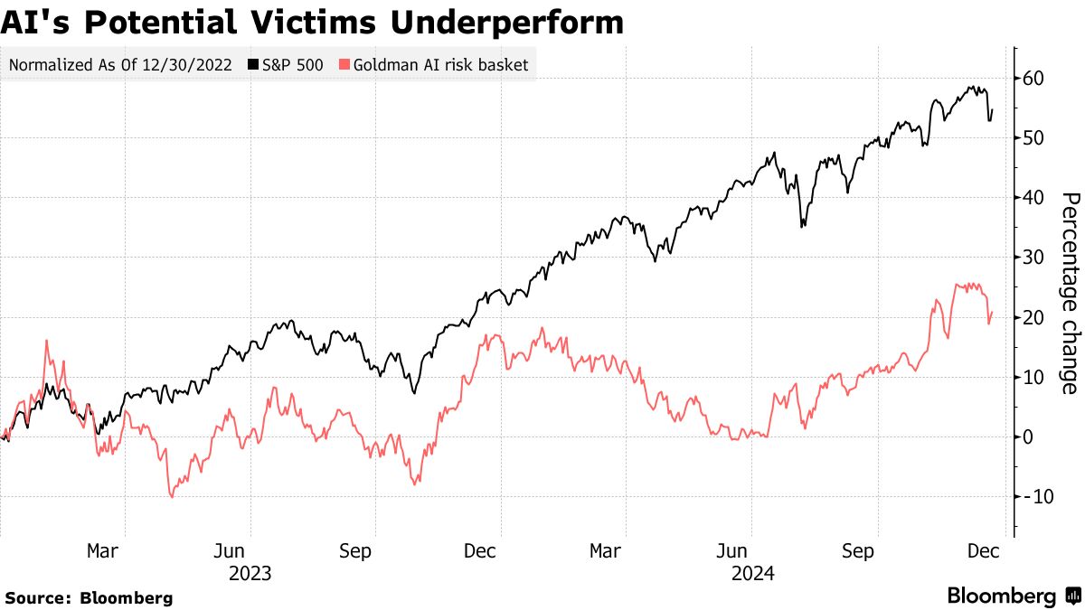 当然,还有许多其他公司表现不佳。一篮子被认为面临人工智能高风险的股票自2022年底以来上涨了21%,而标准普尔500指数则上涨了55%。