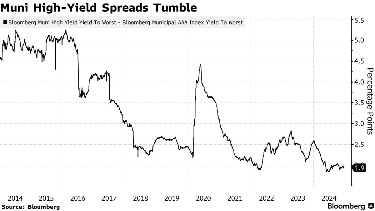 然而,正如米勒所见,高收益市政债券的利差还有进一步收窄的空间,考虑到美国经济的强劲以及美联储预计明年将进一步降低借贷成本。