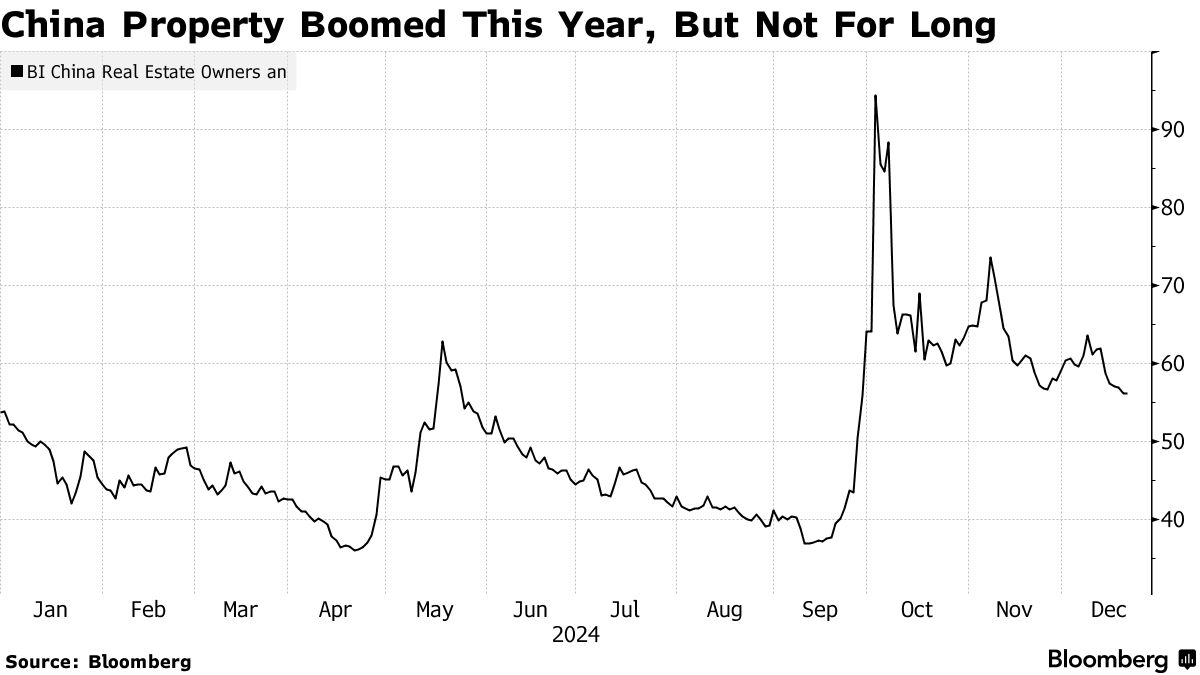 悲观的前景表明,中国开发商最近股价的改善可能是短暂的。到12月23日, 彭博社的行业指标今年上涨了约2.5%,此前连续四年下跌。但这次反弹——主要是由于9月份刺激措施推动的反弹——已经开始失去动力。