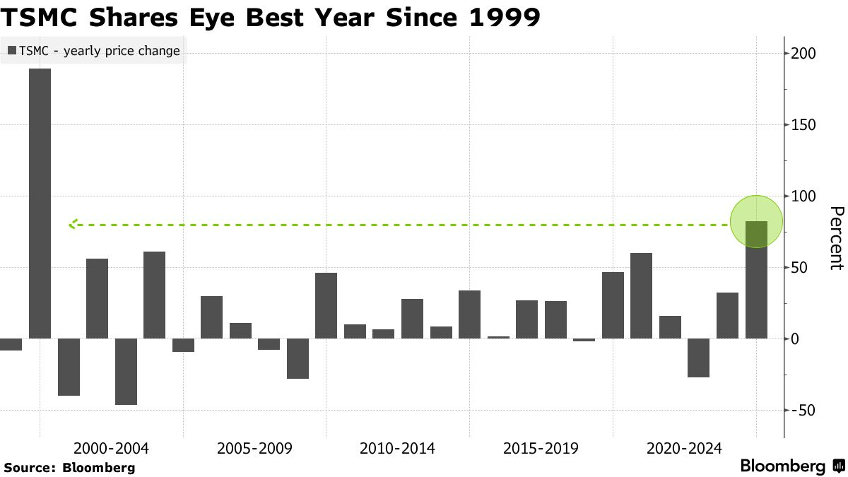 台湾半导体制造公司的股票触及历史新高,作为全球最大的合同芯片制造商,预计将实现25年来最佳的年度股票表现。