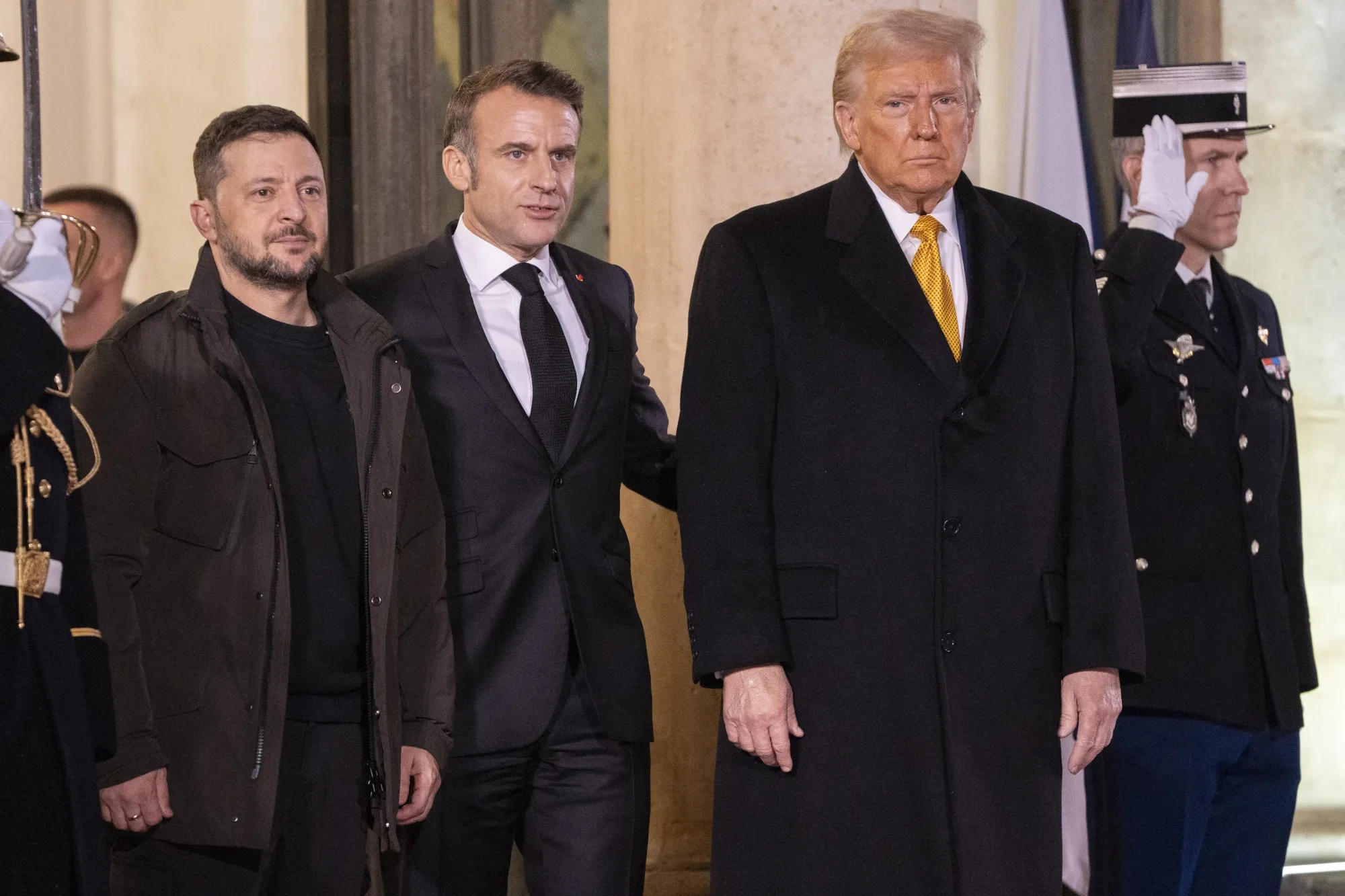 乌克兰总统弗拉基米尔·泽连斯基(左),法国总统埃马纽埃尔·马克龙,以及美国当选总统唐纳德·特朗普于2024年12月7日在巴黎。