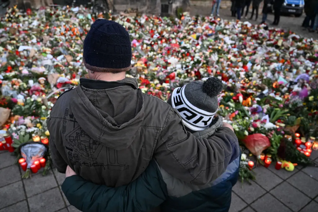 哀悼者在德国马格德堡为12月20日汽车冲撞袭击的受害者拥抱,临时搭建的花卉和蜡烛纪念碑前。