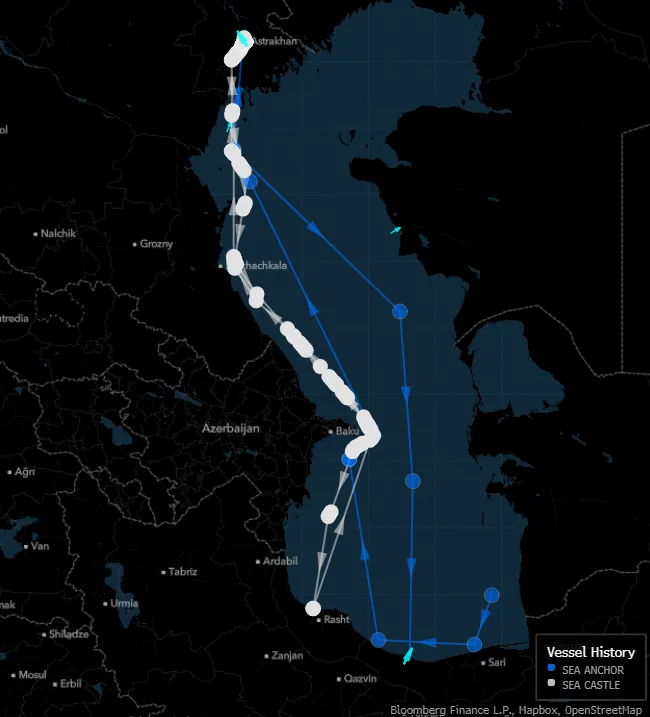 自2023年中期以来,几艘之前在地中海和黑海航行的Crios船只突然转向里海,并自那时以来一直在伊朗和俄罗斯之间往返,根据彭博社编制的船舶追踪数据。