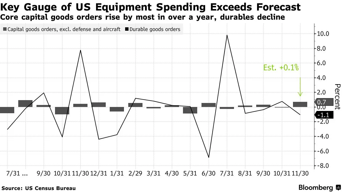 强劲反弹 | 美国工厂对商业设备的订单在11月反弹,创下超过一年来最强的月度增长。核心资本货物订单的价值,作为不包括飞机和军事硬件的设备投资的替代指标,上个月增加了0.7%,而10月经过修正为下降0.1%,政府数据显示。11月的增长远强于经济学家预期的0.1%增长。