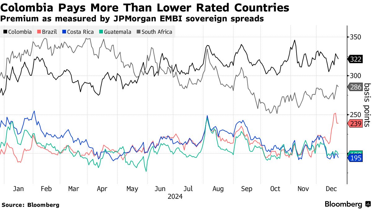 与此同时, peso 今年下跌超过12%,而安第斯国家的主权债务回报率为-1.3%——在彭博 新兴市场指数中表现最差的政府债券,仅次于马来西亚。根据摩根大通的数据,哥伦比亚以美元计价的债券与美国国债之间的利率差距大于巴西及其他信用评级较低国家的差距。