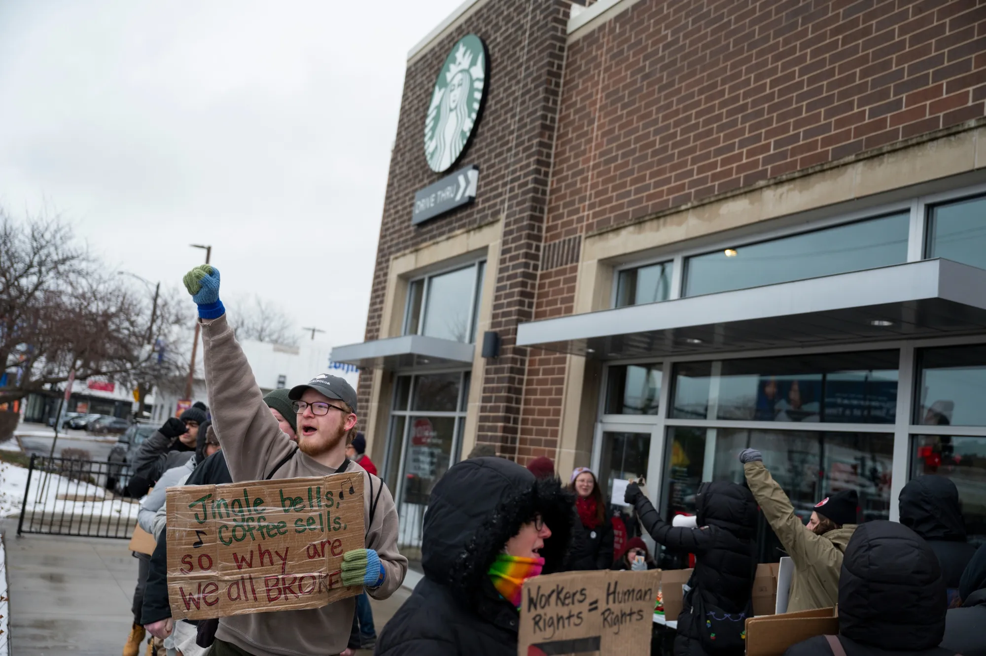 星巴克工人联合会成员于12月20日在芝加哥的一家星巴克门店外示威。