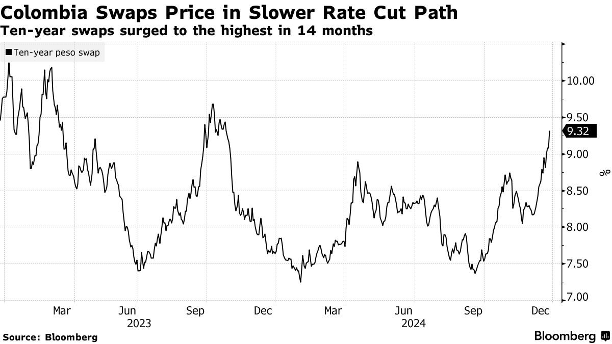 十年期掉期在周四上涨了24个基点,达到9.32%,是自2023年10月以来的最高水平,彭博社的数据表明。在圣诞前夕的讲话中,总统古斯塔沃·佩特罗宣布,哥伦比亚的基本工资将在明年增加9.5%,是经济学家对2025年通胀预期的两倍多。