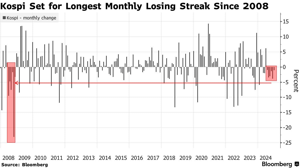 基准Kospi正朝着自2008年以来最长的月度下跌趋势前进,全球投资者加速撤资。该指数今年下跌超过8%,而MSCI Inc.的全球股票指数则上涨了18%。