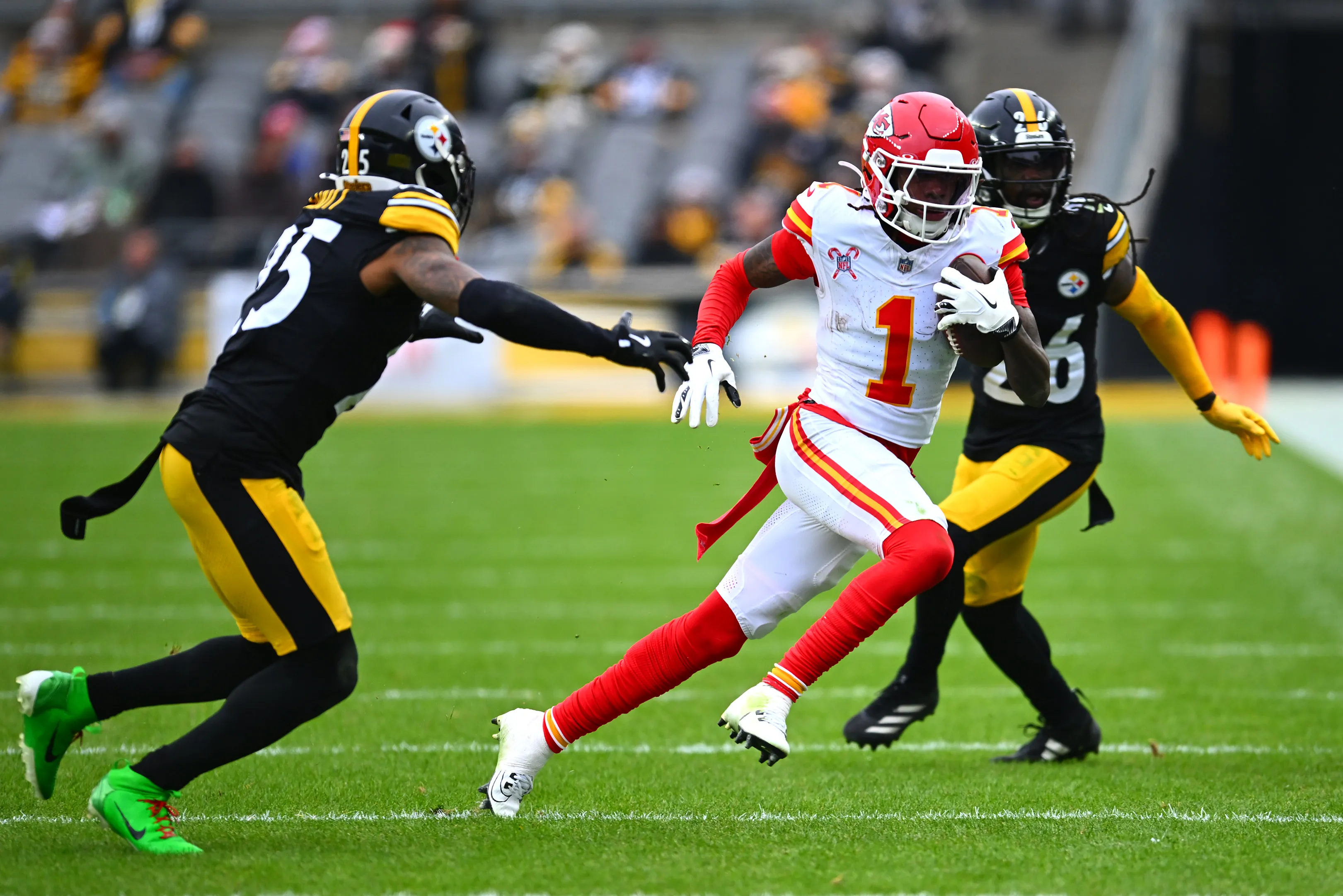 堪萨斯城酋长队的#1 Xavier Worthy在12月25日的匹兹堡Acrisure体育场第四节被匹兹堡钢人队的#25 DeShon Elliott追赶。