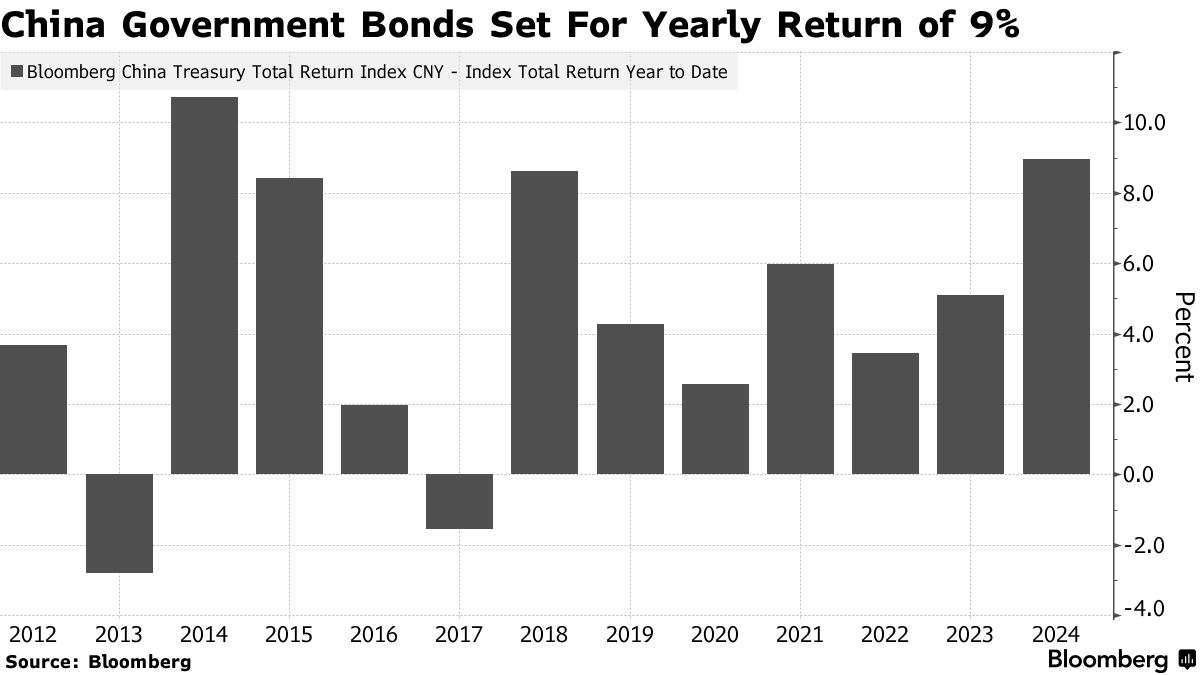 中国政府债券有望迎来十年来最佳表现,地方基金经理和策略师预测2025年将有更多收益。