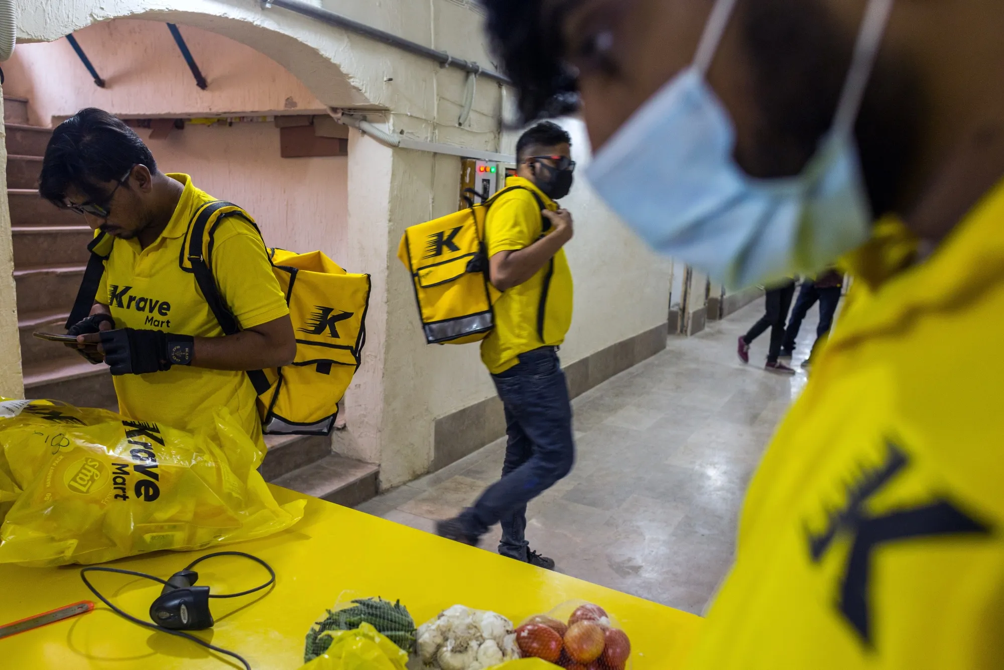 Krave Mart 的配送骑手在该公司位于卡拉奇的一个地点检查订单。