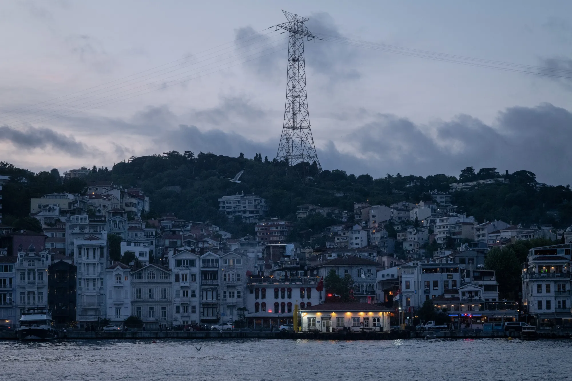 土耳其伊斯坦布尔博斯普鲁斯海峡上方的住宅建筑上的电力塔。