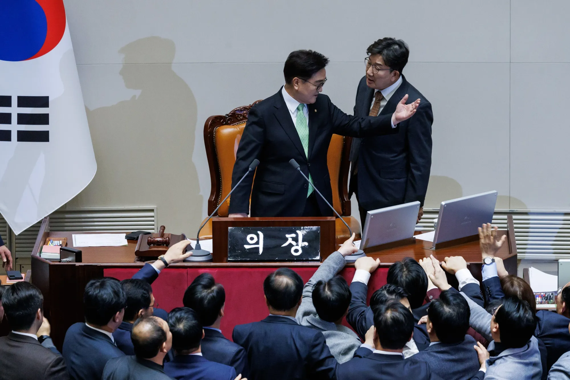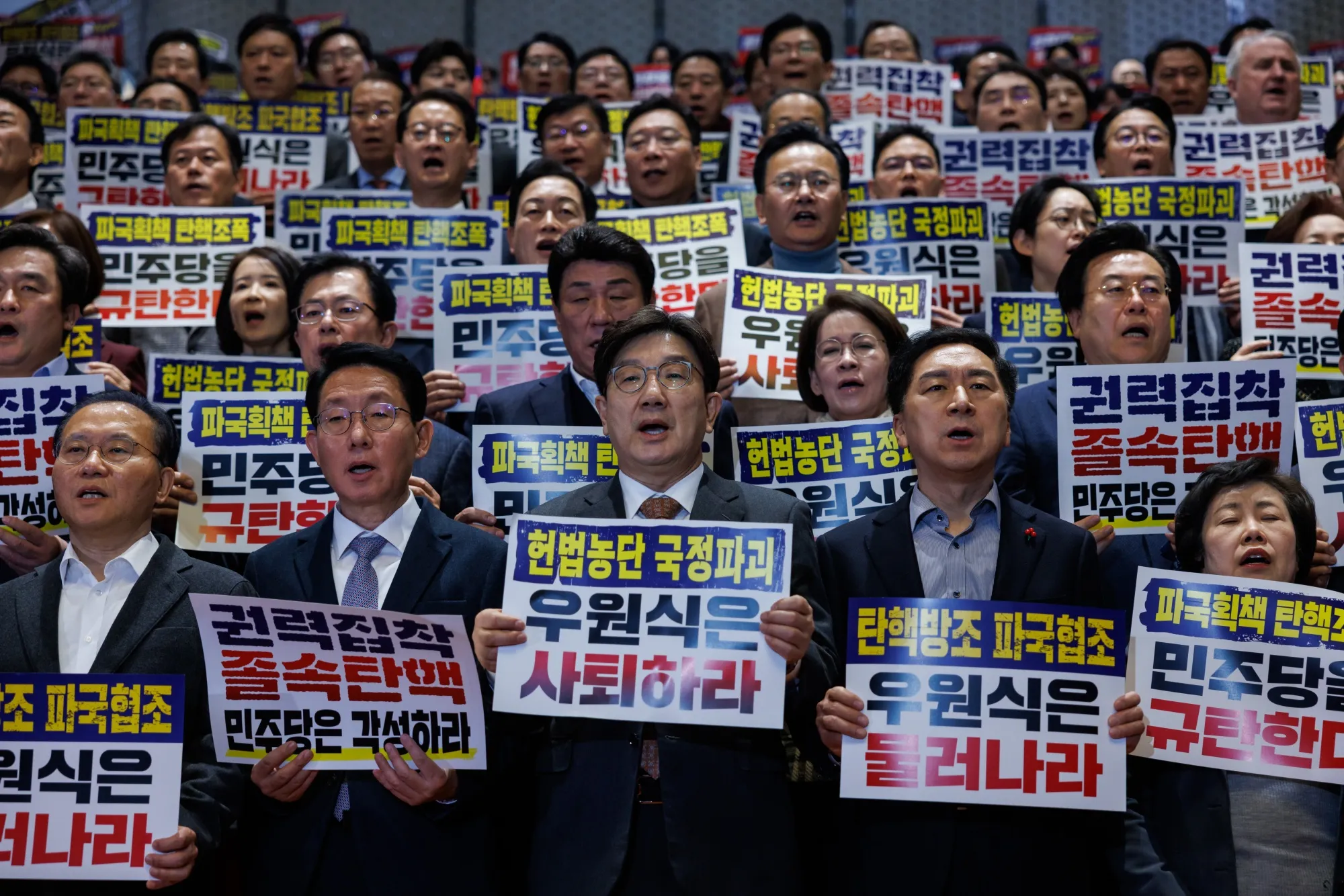 政党立法者在12月27日首尔国会对对韩德洙的弹劾动议投票后高呼口号并举着标语牌。
