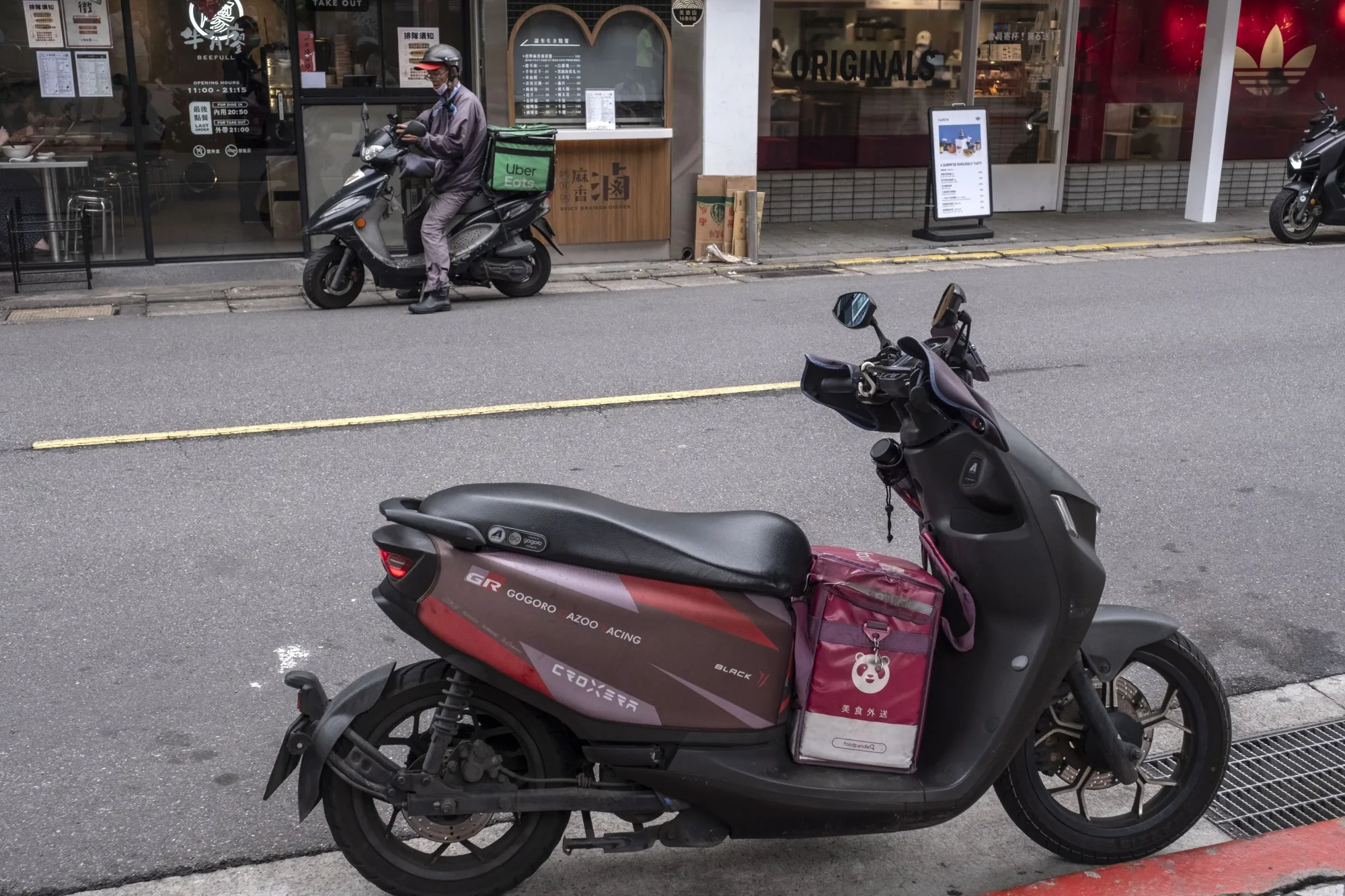优步外卖和送餐英雄公司的Foodpanda在台湾台北的摩托车送餐袋