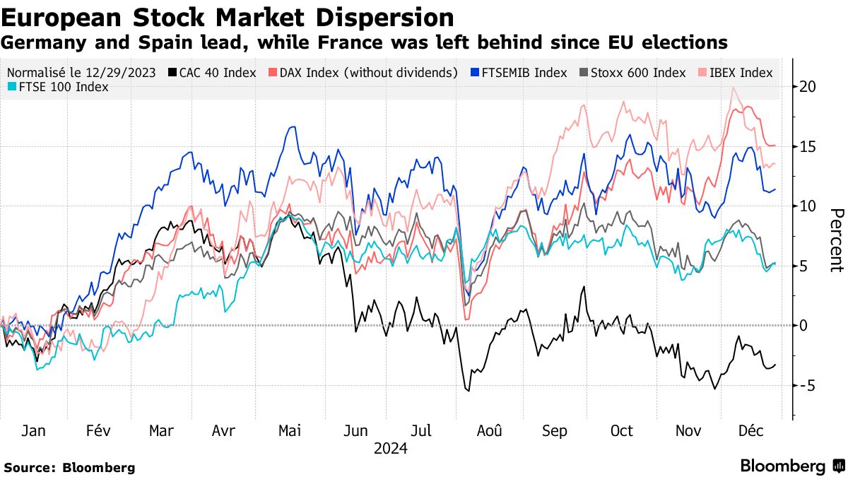 法国的CAC 40今年表现不佳,因政治风险上升而下跌约2.5%,而德国的Dax则引领欧洲股市,除去股息上涨超过15%。