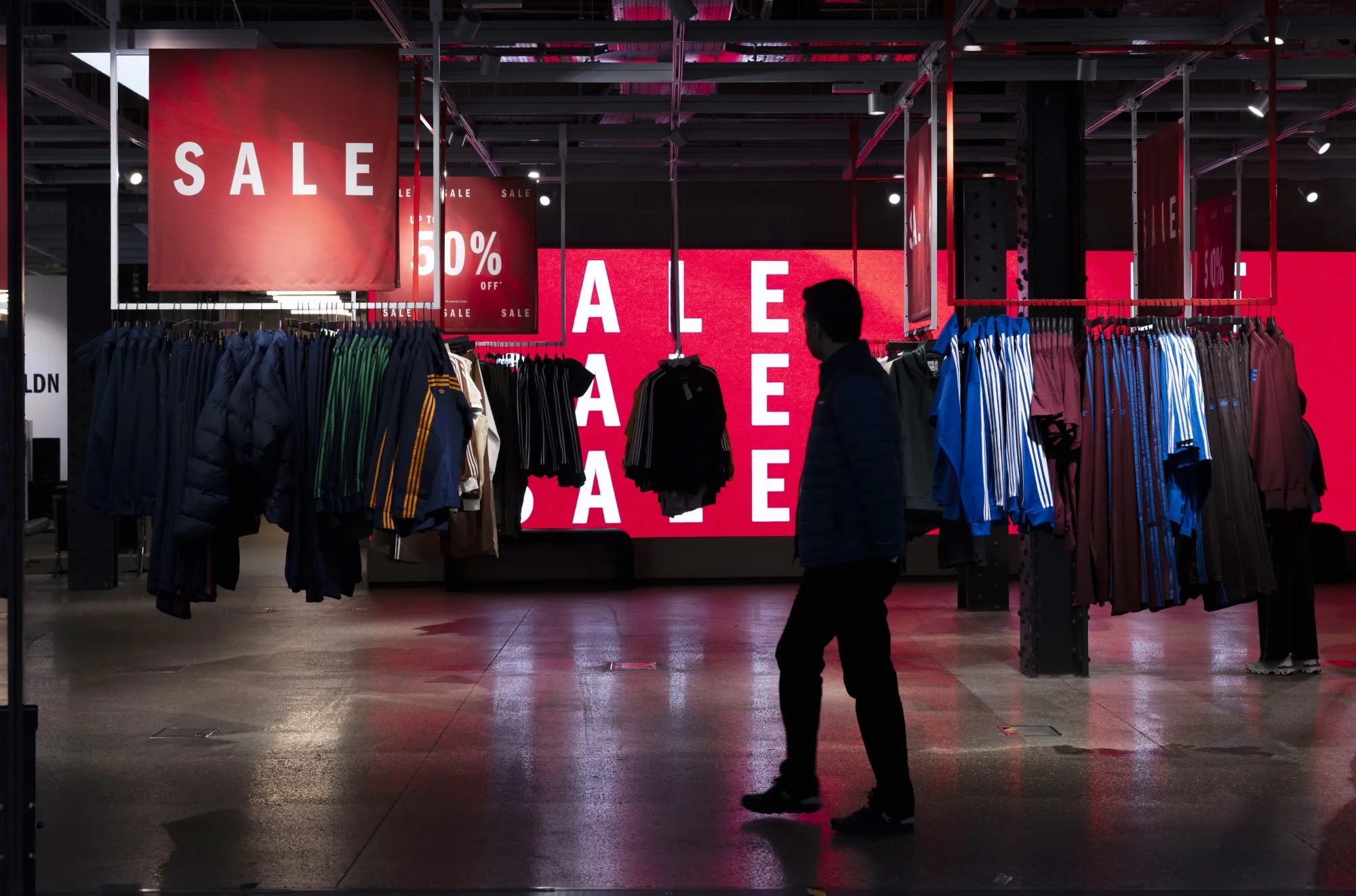 一位购物者在英国伦敦的传统节礼日促销期间走过一个促销标志,时间是12月26日。