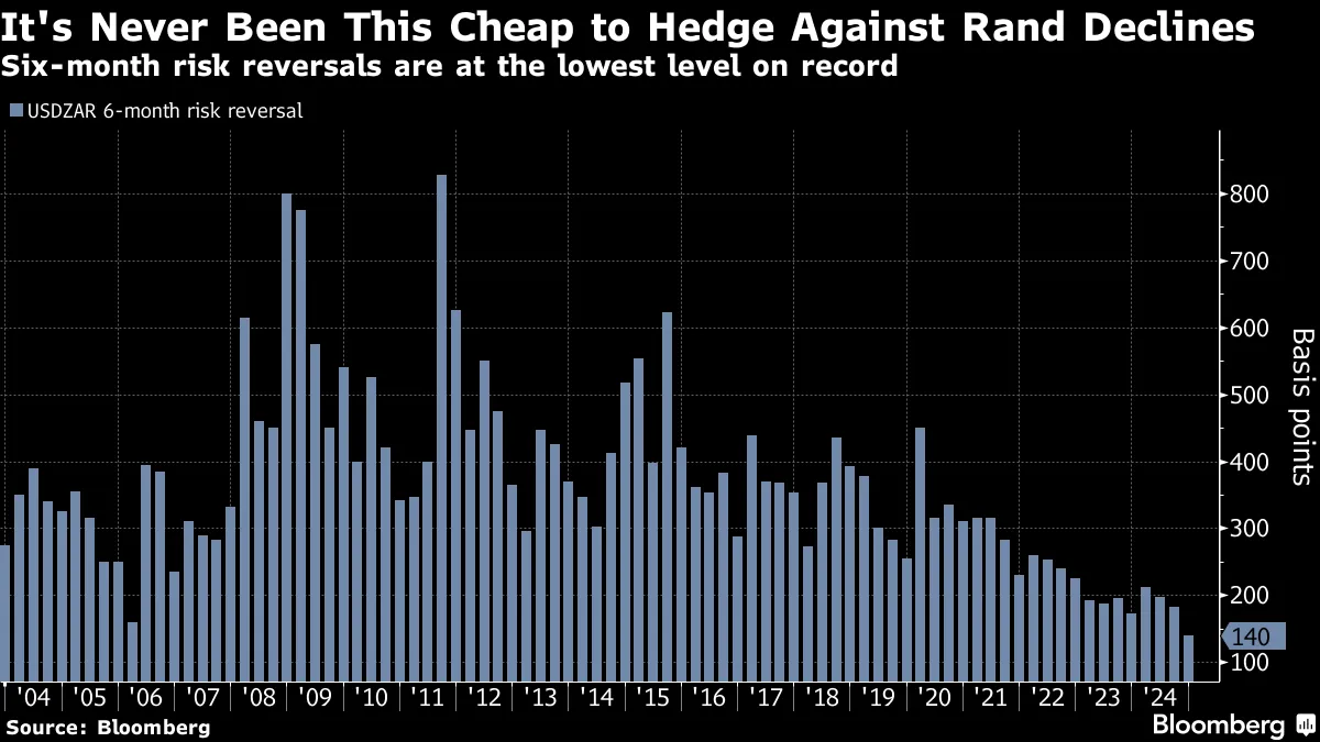 但随着兰特已经抹去2024年的所有涨幅,并徘徊在自5月选举以来的最弱水平,期权交易者押注于推动12月前上涨的基本面将在新年后重新发挥作用。