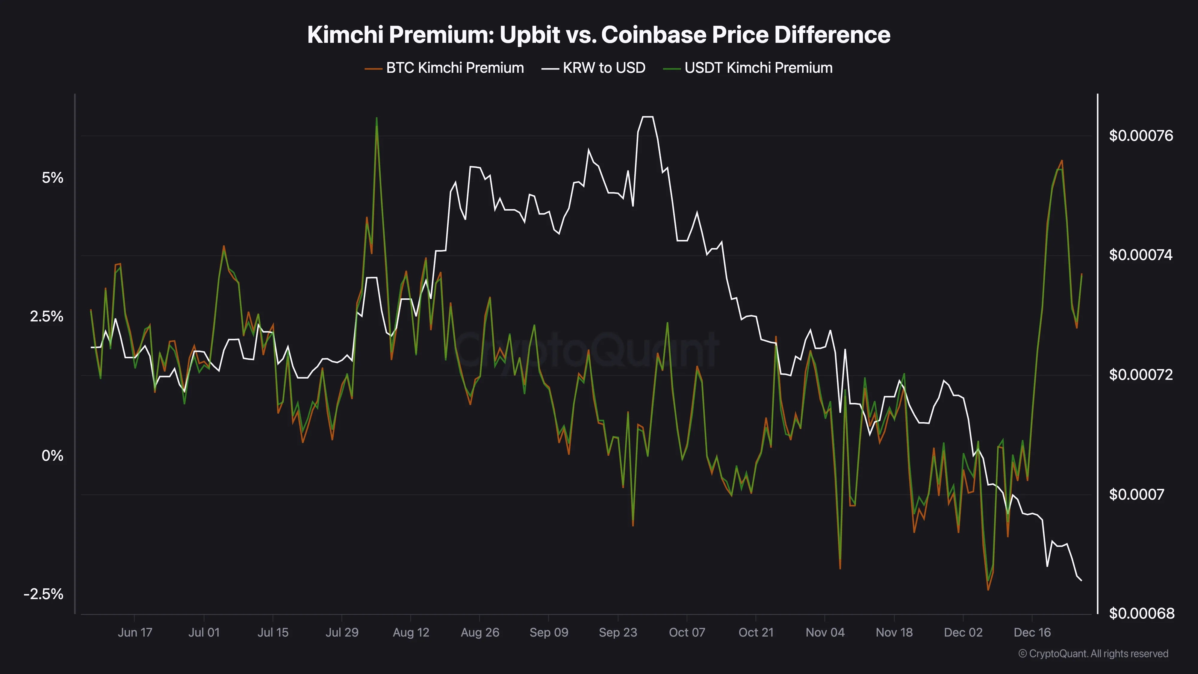 “泡菜溢价”在韩国政治动荡中飙升至四个月高点。(来源:CryptoQuant)来源:Upbit,Coinbase,CryptoQuantCryptoQuant创始人兼首席执行官Ki Young Ju表示:“韩国在政治动荡、出生率下降和经济增长放缓的背景下,面临前所未有的财富外流。通货膨胀的担忧促使人们将韩元资产转换为美国股票、比特币、黄金和美元。许多加密投资者更倾向于使用交易所而非银行,Tether和比特币的交易溢价在2-5%之间。