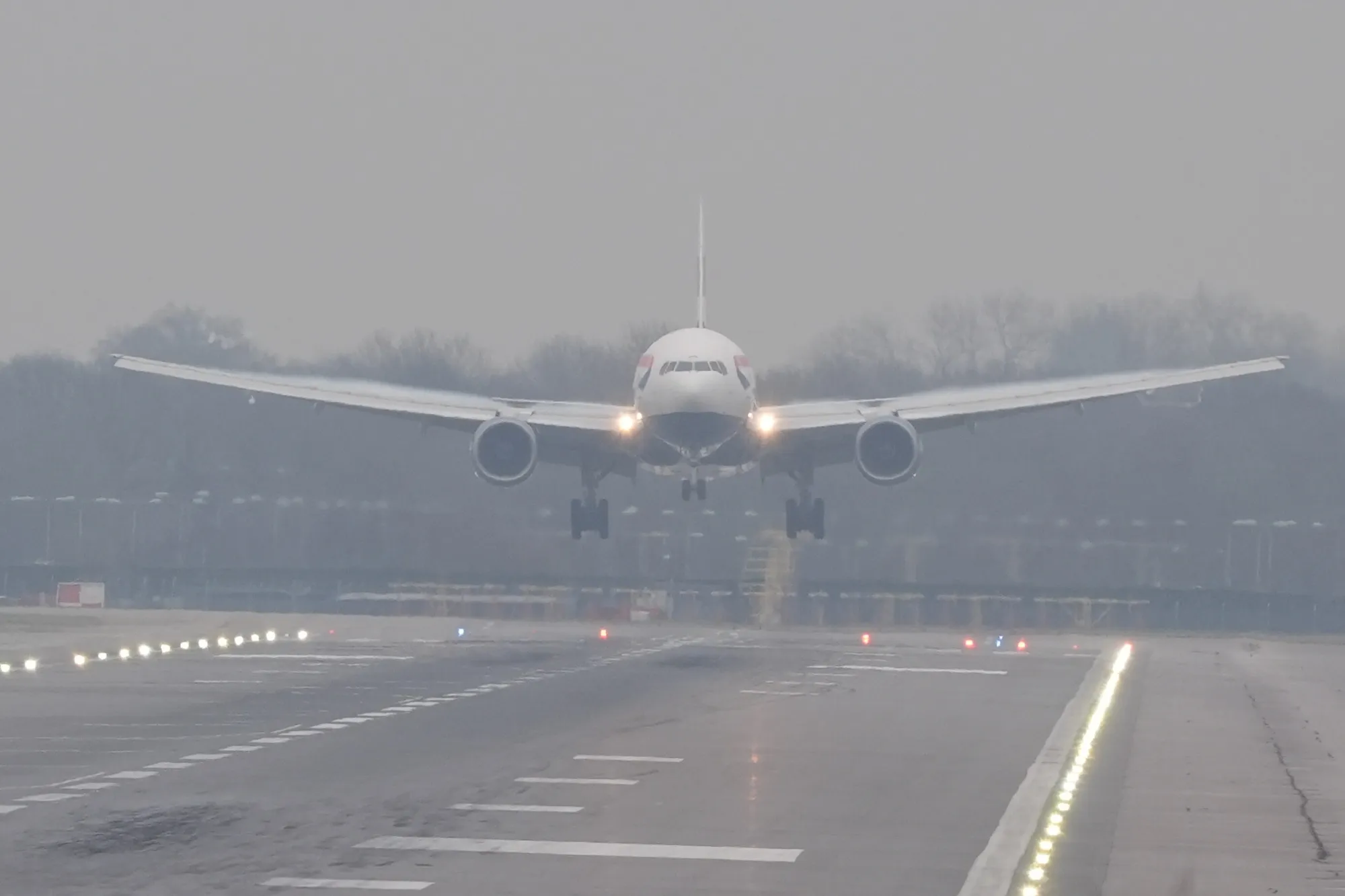 一架飞机在伦敦盖特威克机场的雾霭中降落,12月28日。
