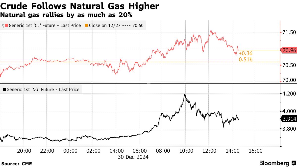 由于天气预报比正常气温更冷,推动天然气期货上涨20%,这是自2012年合约开始交易以来的最大涨幅。天然气紧张可能刺激短期石油消费,尽管需求前景依然疲软。