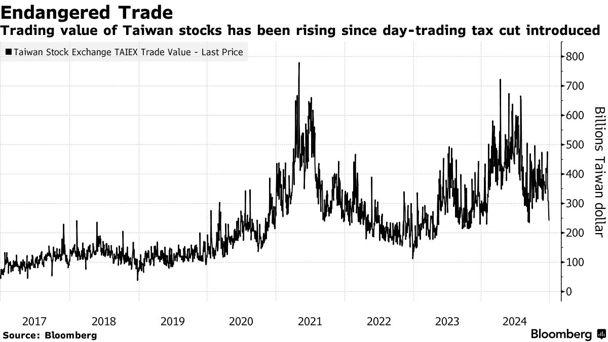 交易税在2017年从0.3%减半至0.15%,被认为有助于提升台湾2.5万亿美元的股票市场的成交量,该市场是全球第十大市值市场。该减免已多次延长,如果立法者未能投票通过再次恢复,减免将在年底到期。