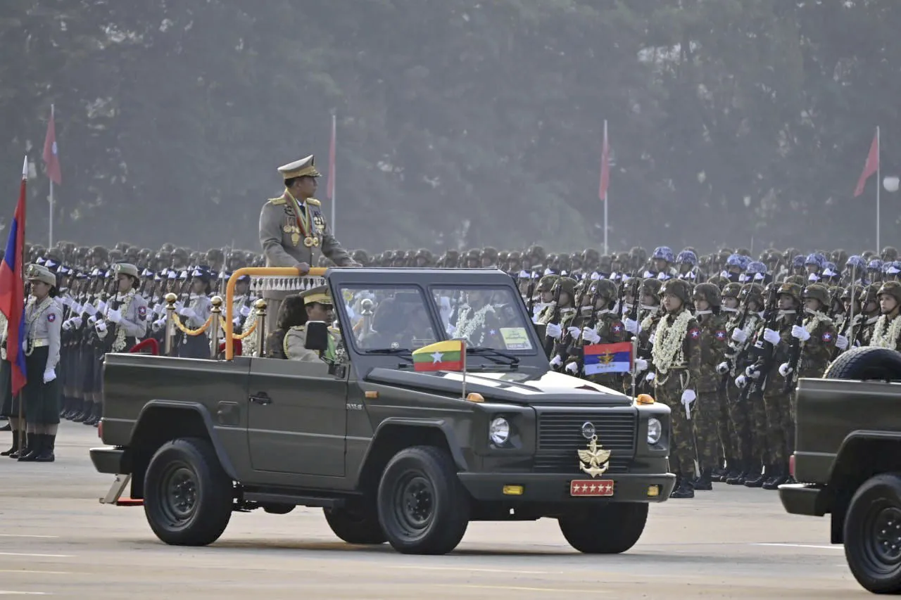 缅甸军政府首席将领敏昂莱在2023年3月27日于该国行政首都内比都举行的年度军事阅兵中视察部队。