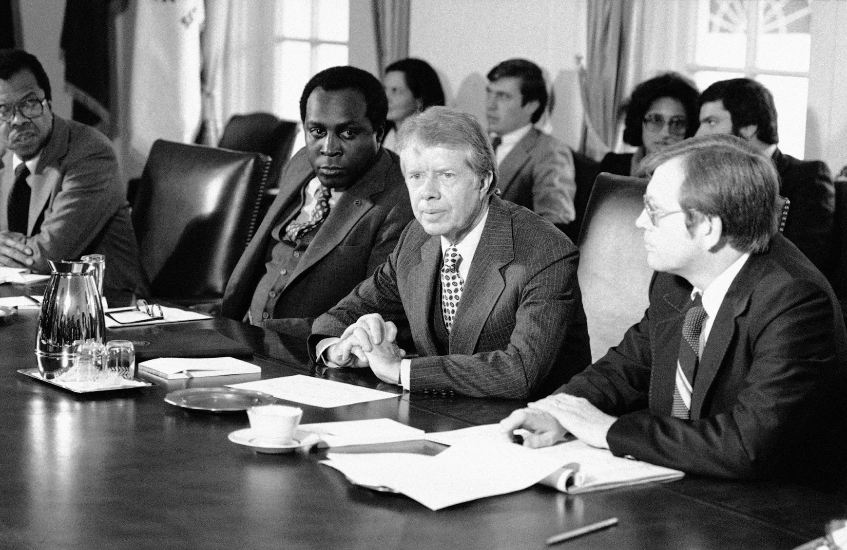 总统吉米·卡特于1978年12月4日在华盛顿白宫主持了一次黑人领袖会议。
