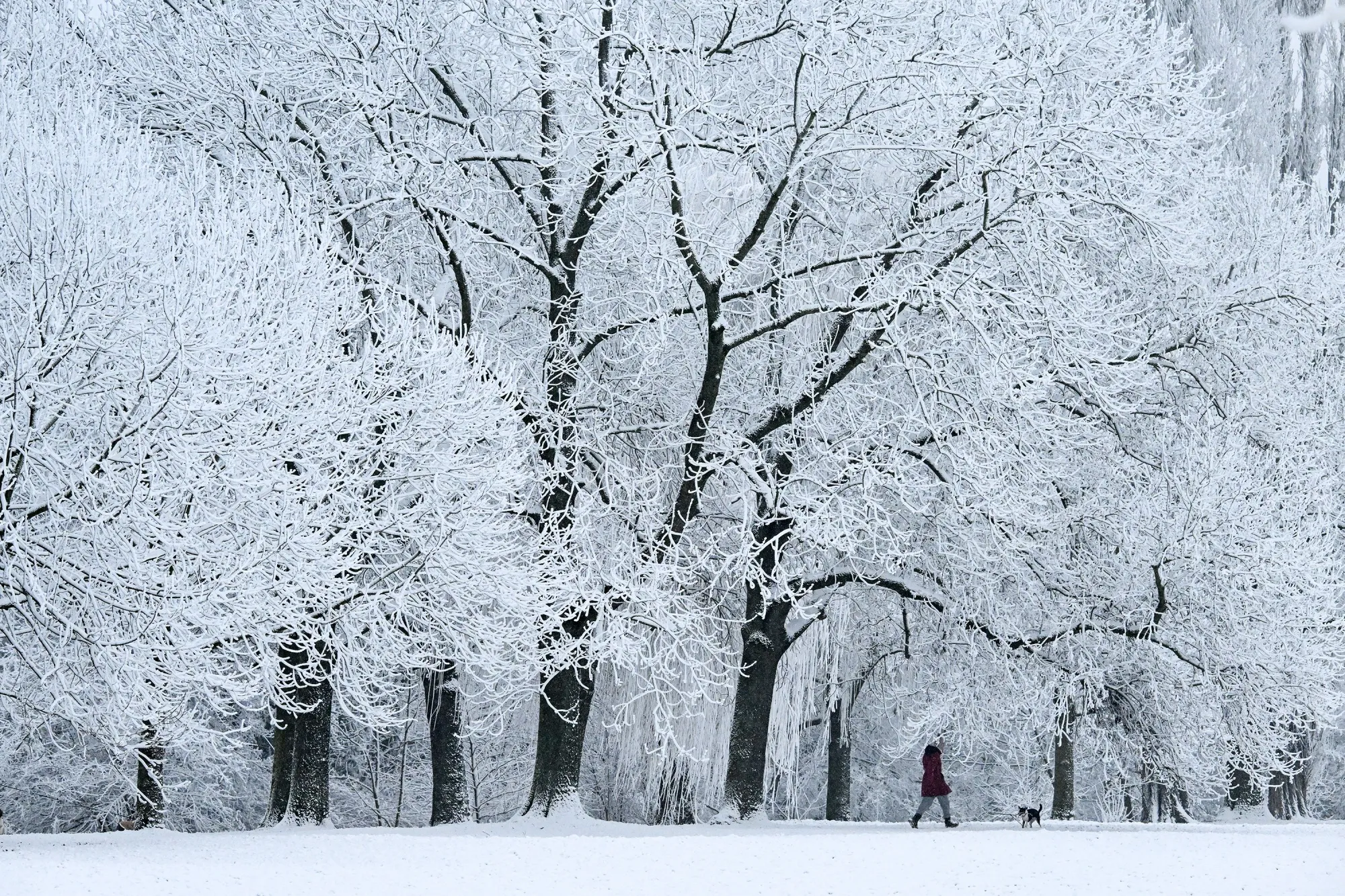 12月29日,德国西部法兰克福的美因河堤岸公园里,一位遛狗者。