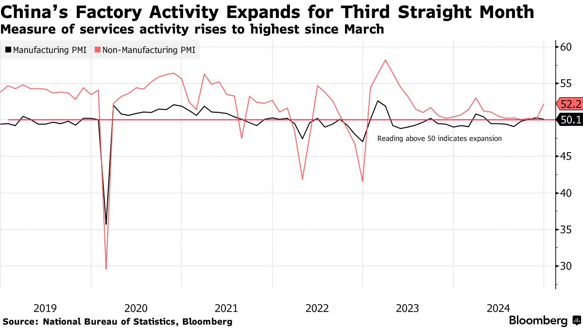 摄影师:Qilai Shen/Bloomberg中国的服务业活动以九个月以来最快的速度扩张,而制造业连续第三个月增长,显示出在北京的刺激政策后,国内需求正在改善。