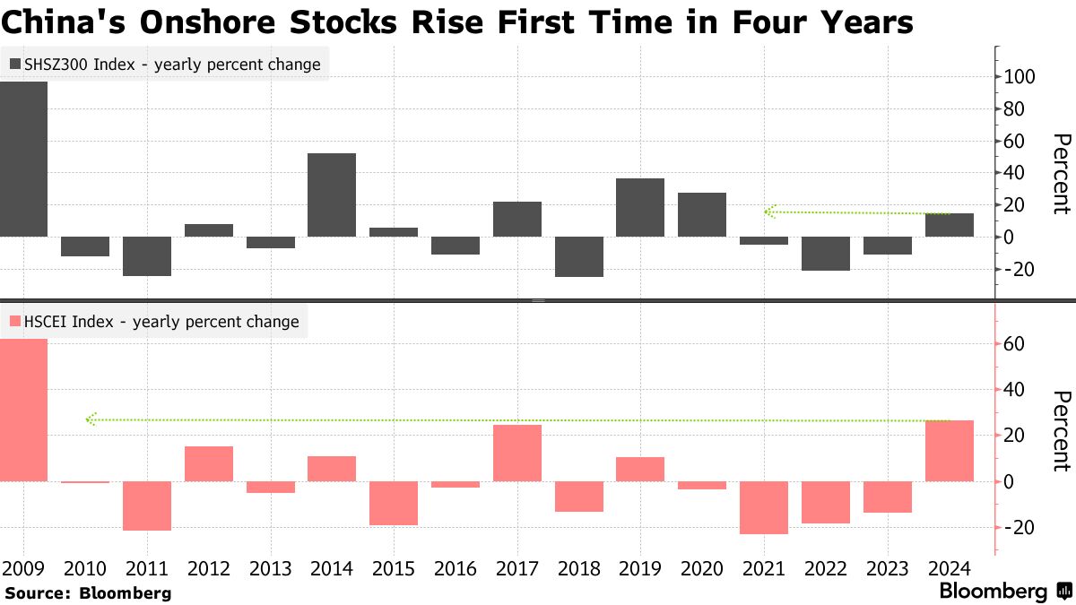 在岸基准CSI 300指数自2023年底以来上涨近15%,结束了前所未有的三年亏损。一个衡量在香港上市的中国股票的指标上涨了26%,创下自2009年以来的最大年度增幅。相比之下,MSCI亚太指数在2024年上涨了约7%。