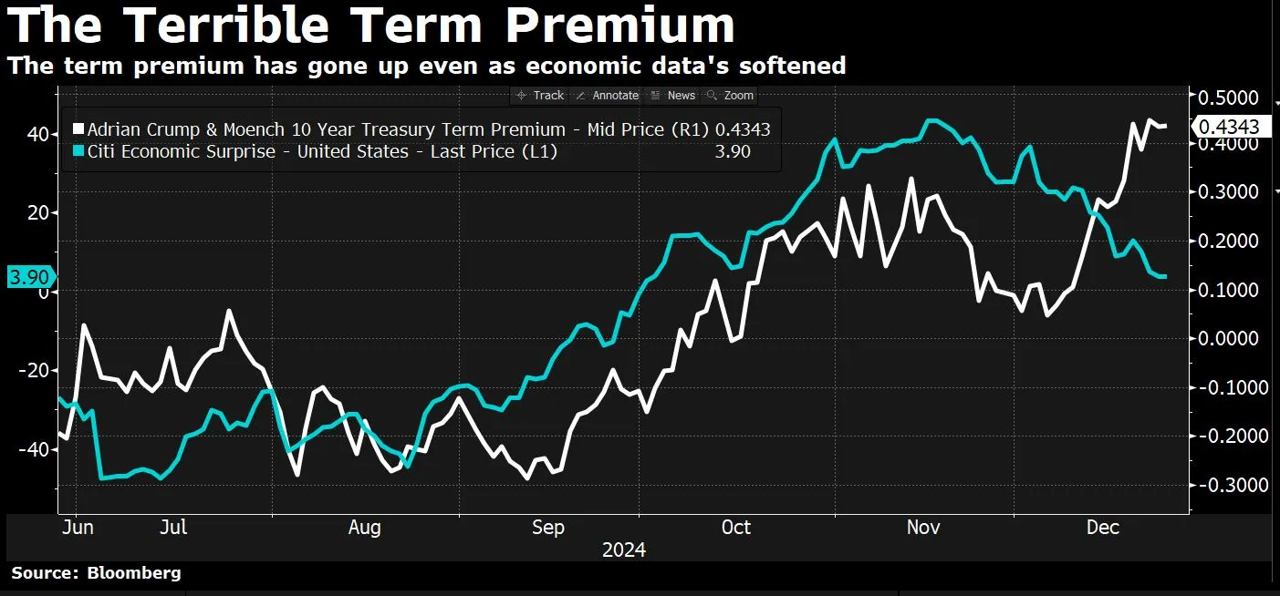 这里存在一种反身性,因为更高的收益率即更高的期限溢价可能会增加美国政府的利息负担,并可能限制新总统的操作空间。所有这些都意味着,如果你在2025年寻找一些可以辩论和沉迷的事情,债券收益率和期限溢价的真实含义无疑是个不错的选择。