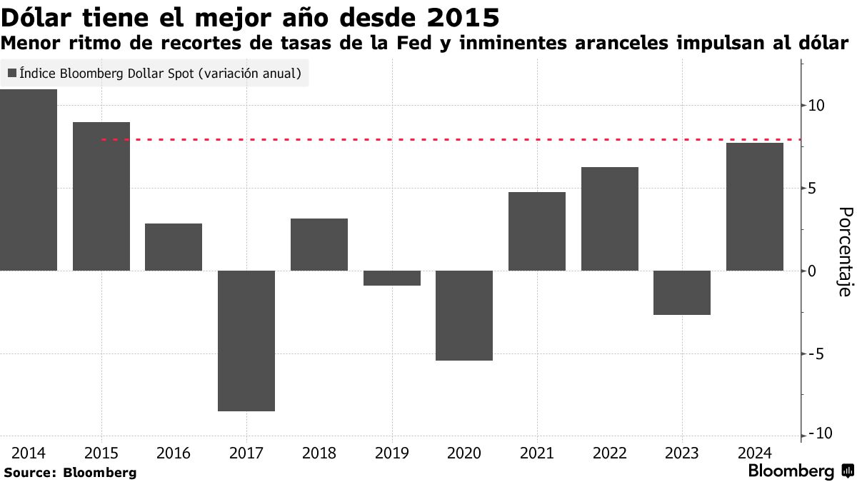 美元在周二走强,标志着其近十年来最大的年度涨幅,因为强劲的美国经济以及当选总统唐纳德·特朗普的减税和关税政策承诺将保持高利率。