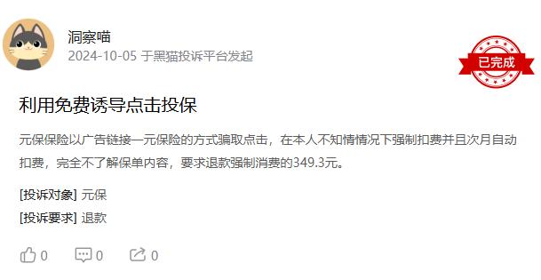 此前,有消费者在黑猫投诉平台上对元保进行投诉。消费者认为元保保险以广告链接一元保险的方式骗取点击,在本人不知情情况下强制扣费并且次月自动扣费,完全不了解保单内容,要求退款强制消费的349.3元。