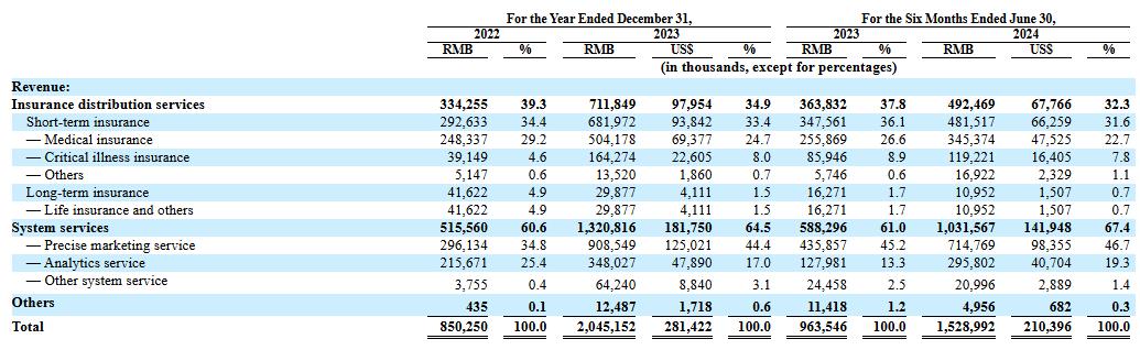 招股书显示,2022年和2023年,元保来自保险分销服务的收入分别为3.34亿元人民币和 7.12亿元人民币,分别占总收入的比例为39.3%和34.9%;公司提供系统服务产生的收入分别为 5.16亿元和 13.21亿元人民币,分别占总收入的比例为60.6%和 64.5%。