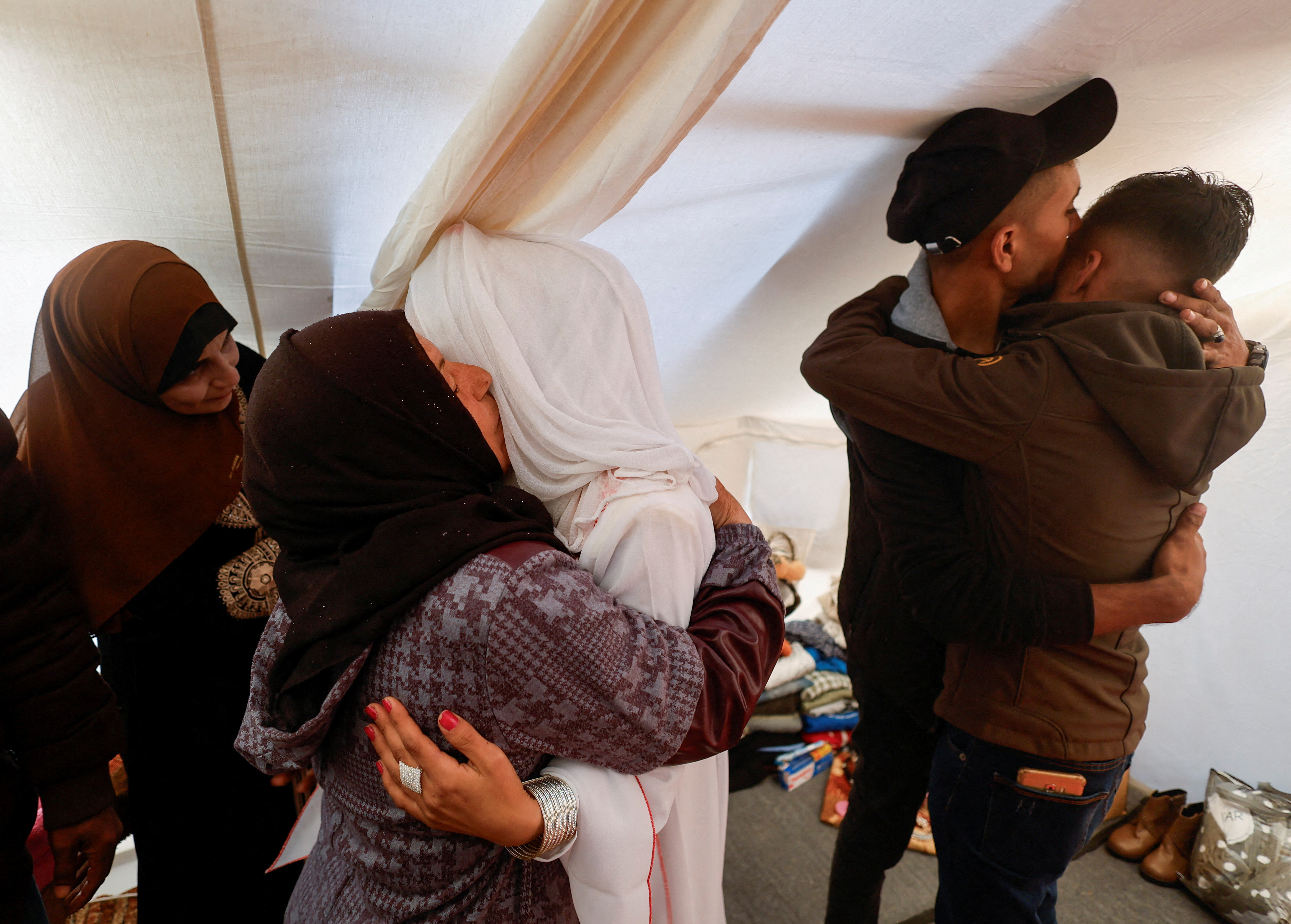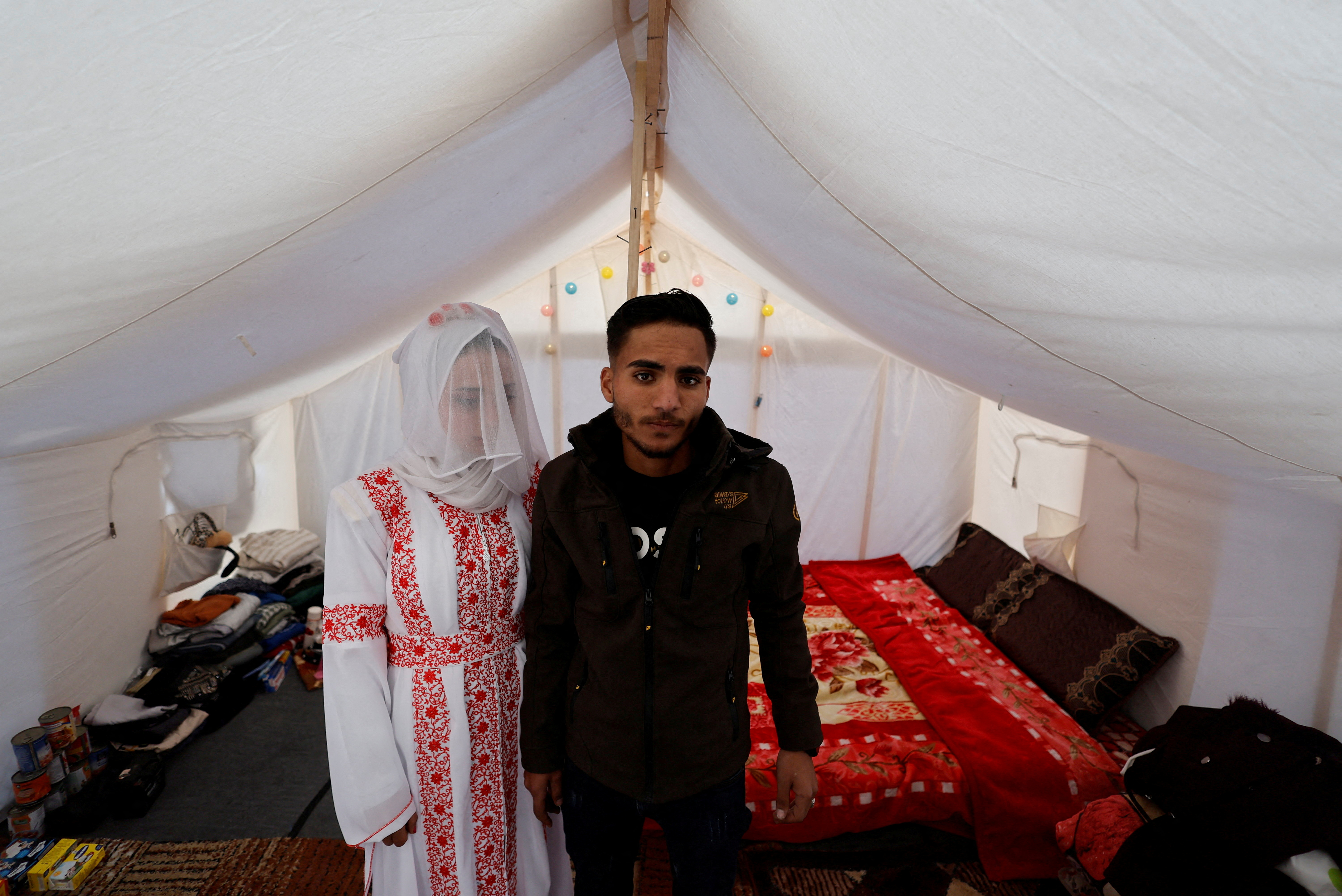 加沙一对夫妇在铁丝网边境围栏旁的帐篷城市结婚 | 路透社