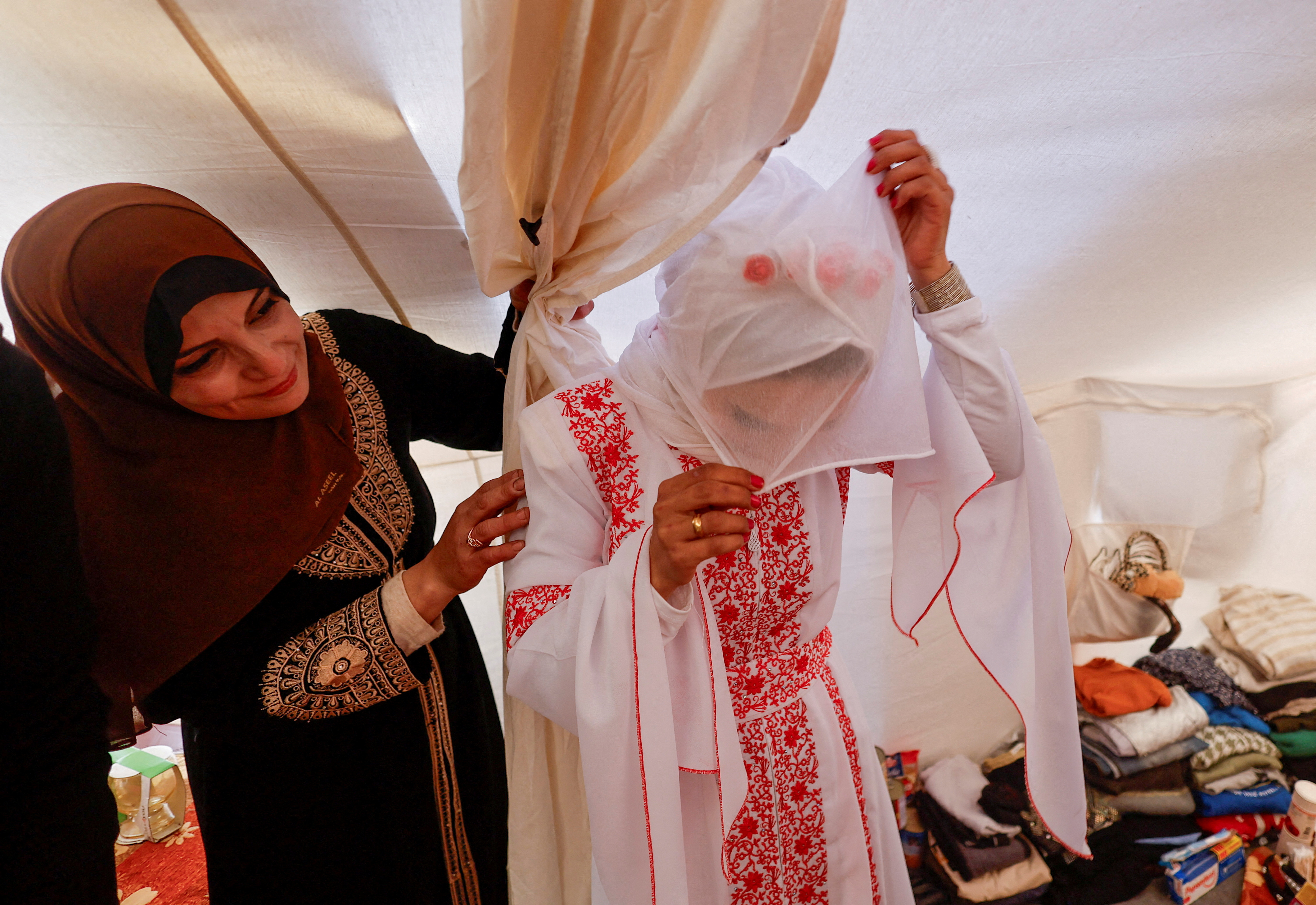 一位巴勒斯坦新娘沙哈德在加沙地带南部拉法区的帐篷营地调整她的面纱,这是在以色列和巴勒斯坦伊斯兰组织哈马斯之间的持续冲突中,她的婚礼日,2024年1月18日。路透社/莫罕默德·塞勒姆