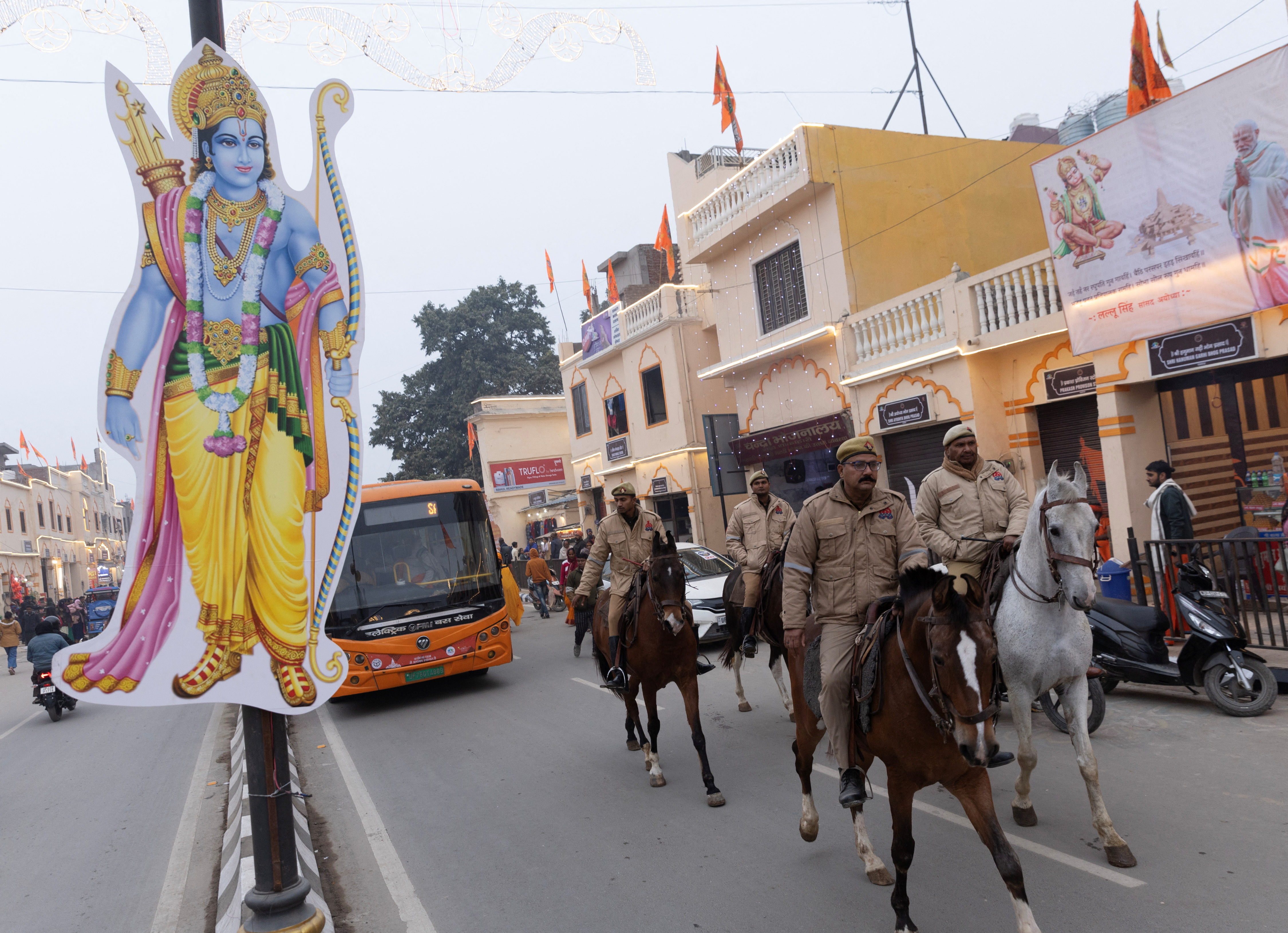 警察在印度阿约提亚的一条街上骑马巡逻,准备在2024年1月20日开放印度教主神拉玛的寺庙。路透社/Adnan Abidi