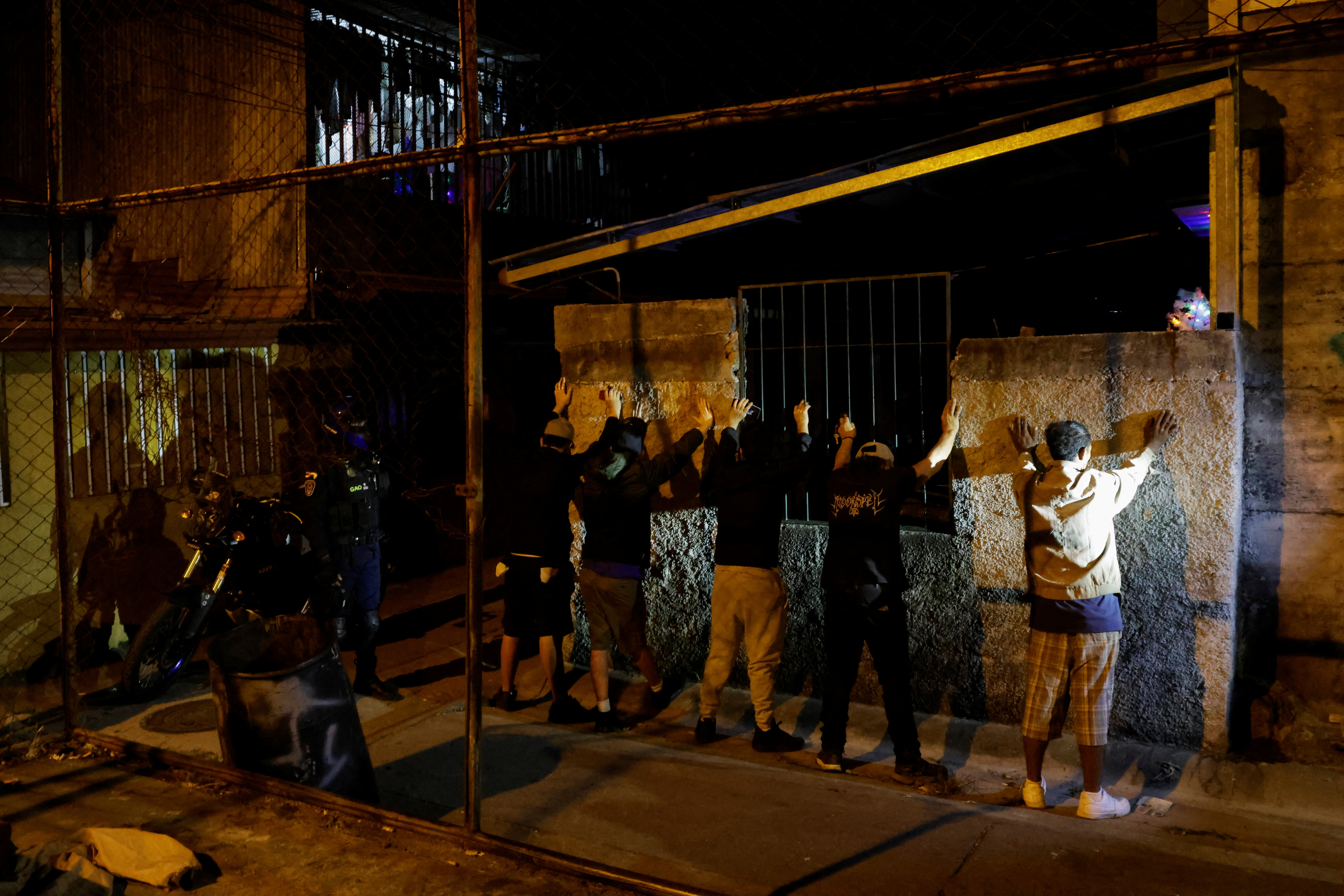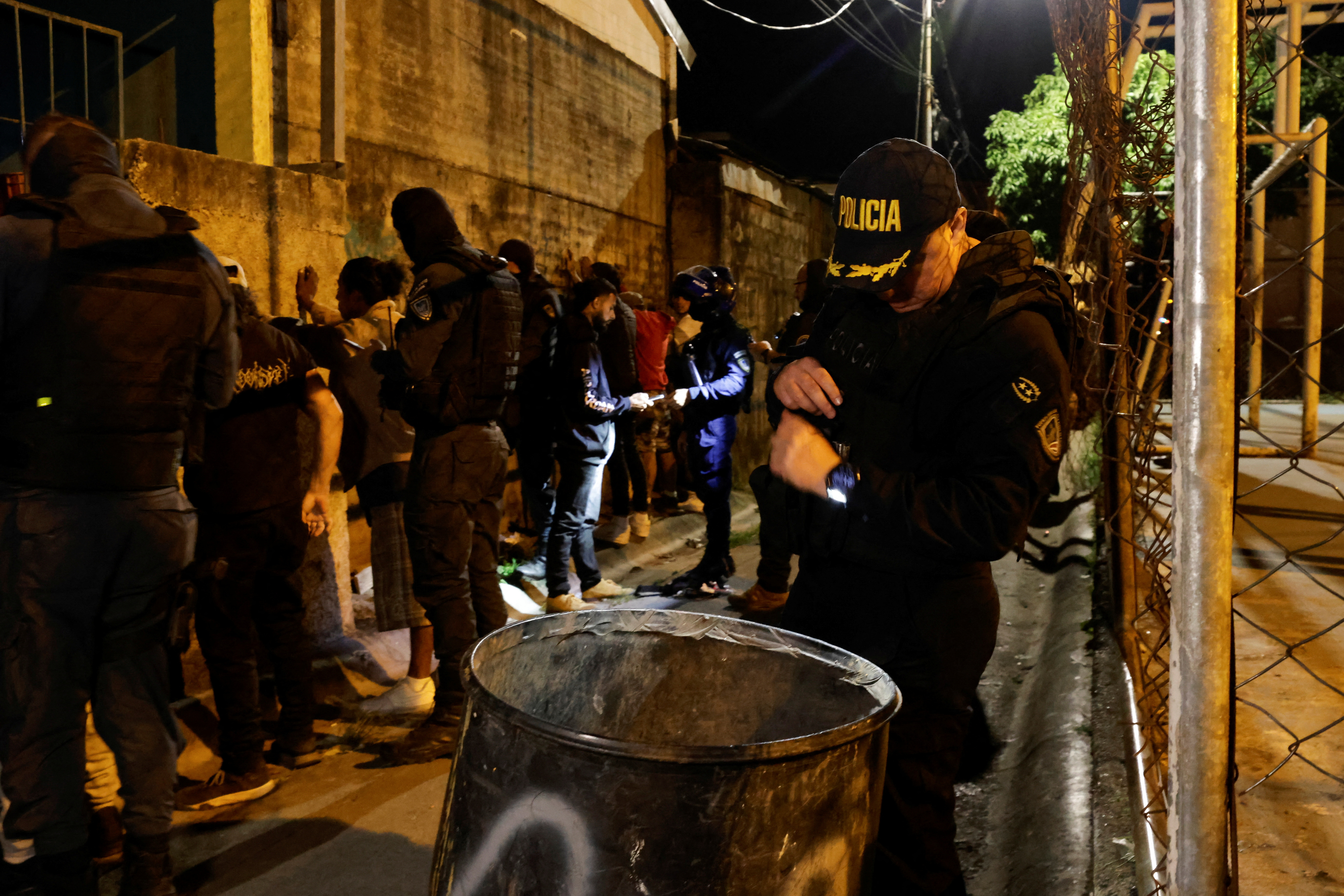 一名警察站在圣何塞,哥斯达黎加,2023年12月8日,执行“哥斯达黎加安全加强”行动期间,与安全部队一起在艰难的社区对男子进行短暂拘留,搜查毒品和武器。路透社/马耶拉·洛佩兹/档案照片