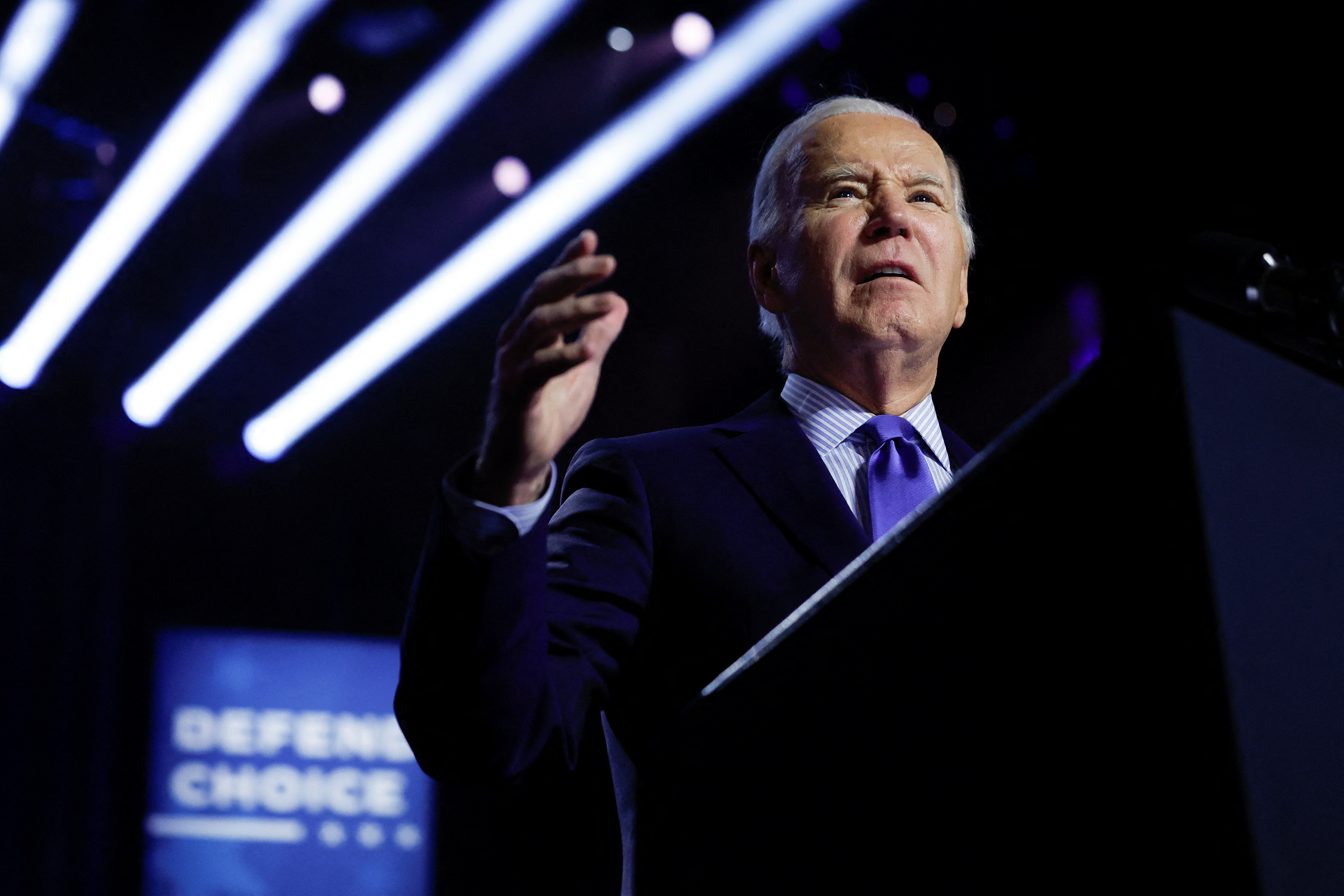 美国总统乔·拜登在2024年1月23日于美国弗吉尼亚州曼纳萨斯的希尔顿表演艺术中心举行的一次关注堕胎权利的竞选活动中发表讲话。路透社/伊夫林·霍克斯坦摄