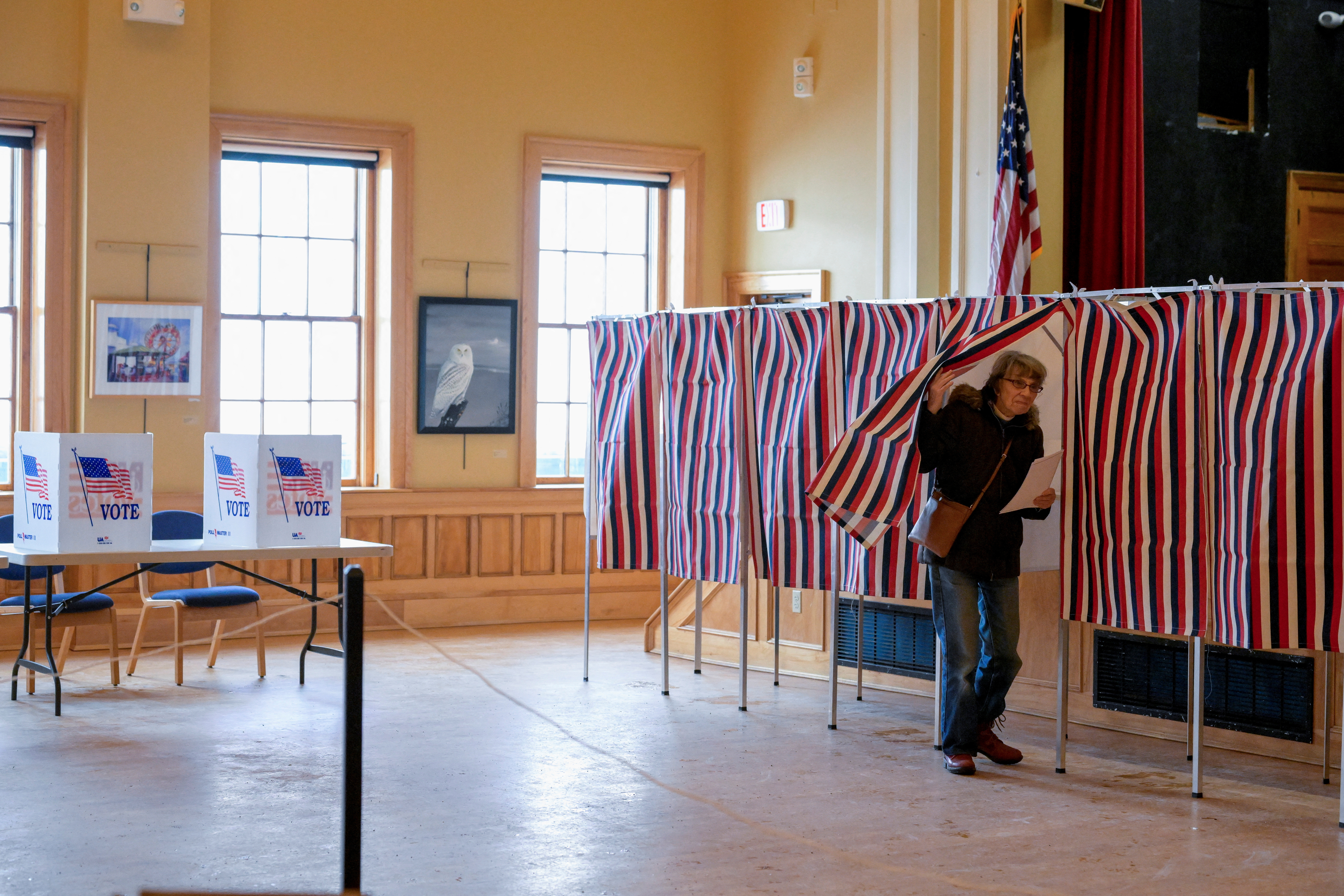 一名选民走进投票亭,在美国新罕布什尔州戈勒姆的梅迪利昂歌剧院填写选票,参加了2024年1月23日举行的美国总统首场全国性初选。路透社/费思·尼尼瓦吉摄