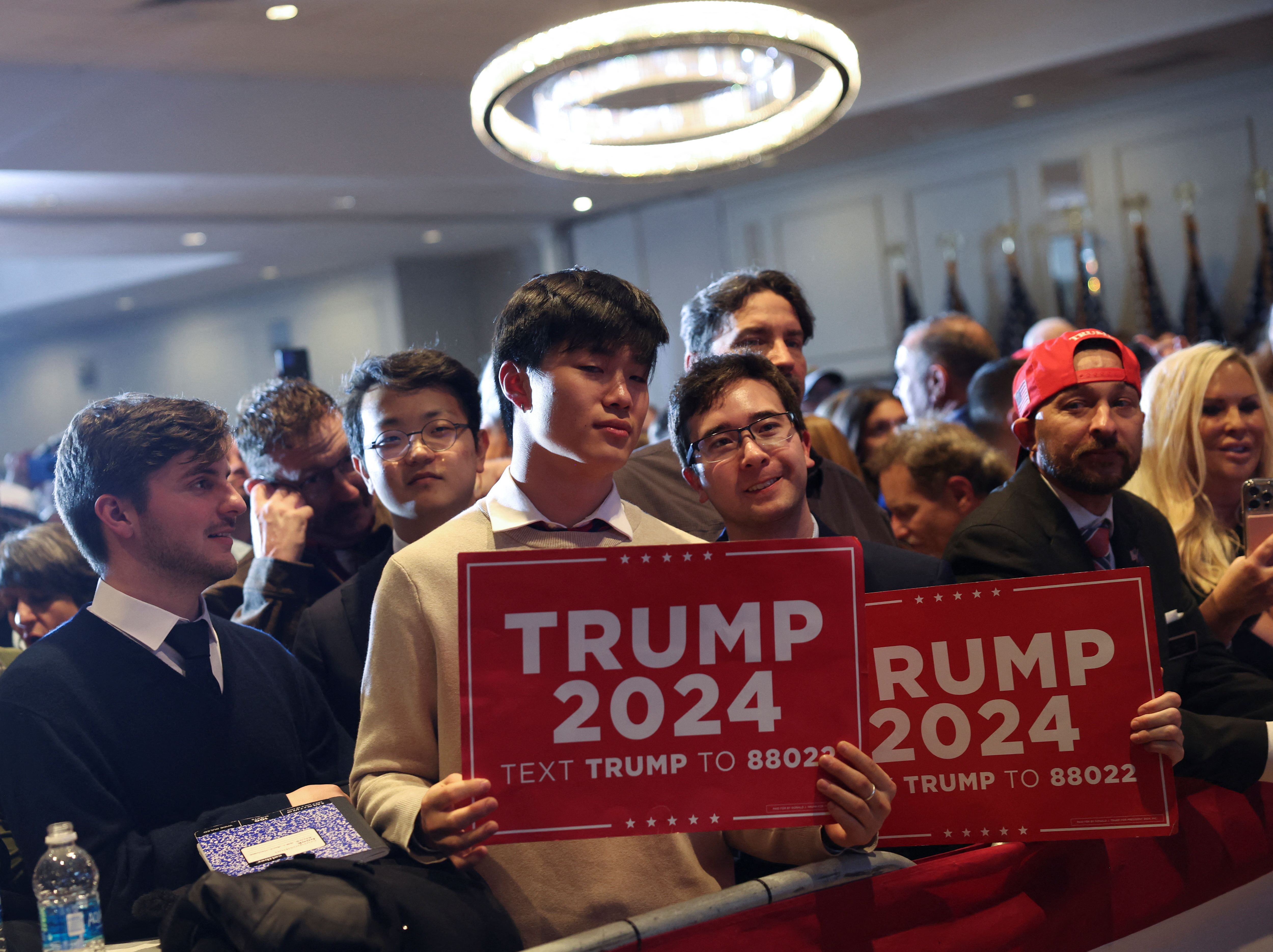 支持共和党总统候选人、前美国总统唐纳德·特朗普的支持者参加了他在美国新罕布什尔州总统初选选举之夜的观看派对,地点在美国新罕布什尔州纳舒厄,2024年1月23日。路透社/迈克·塞加摄