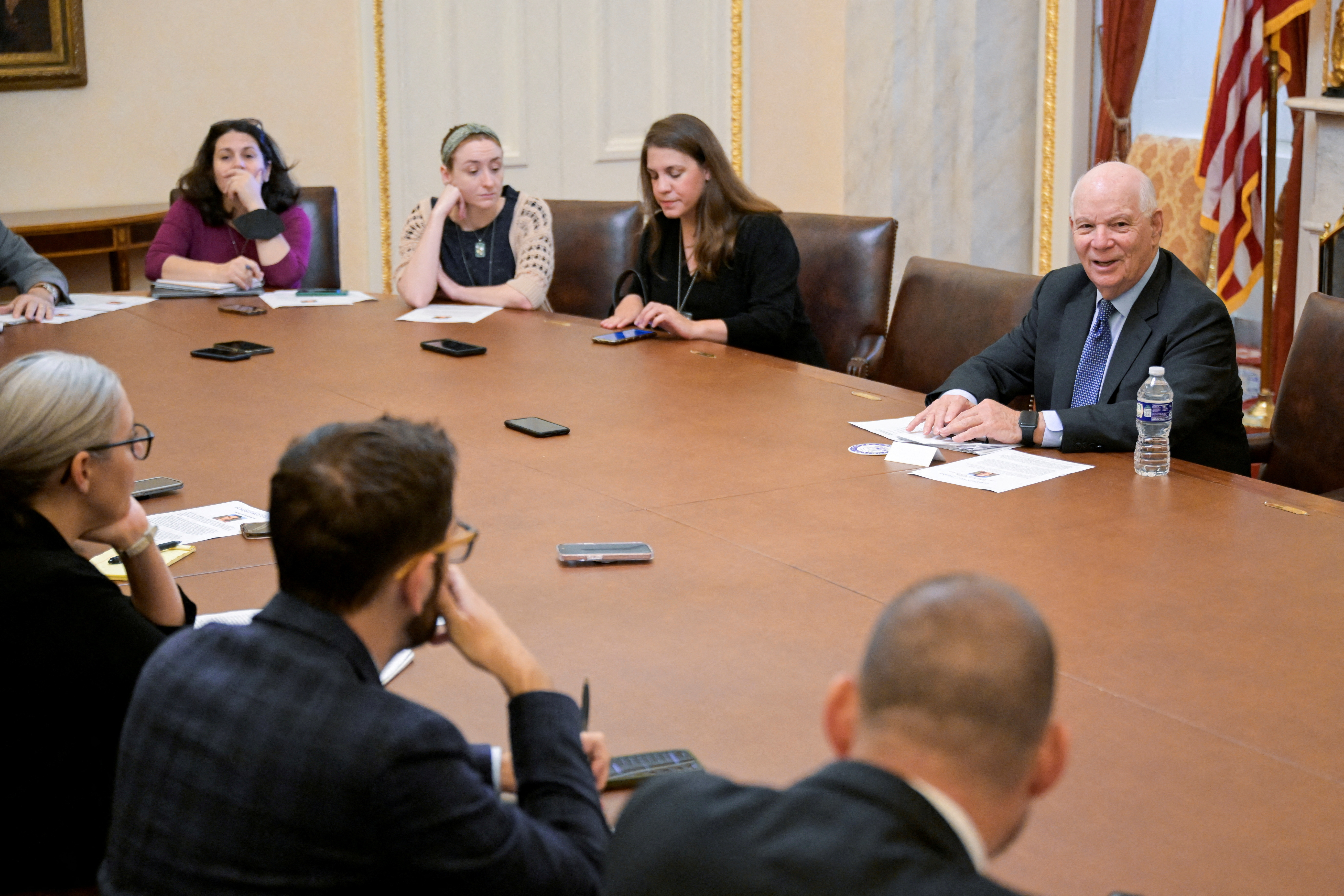 美国参议员本·卡丁(D-MD)在华盛顿国会山就任参议院外交关系委员会主席之前对记者发表讲话,2023年9月28日,美国华盛顿。路透社/Craig Hudson/文件照片