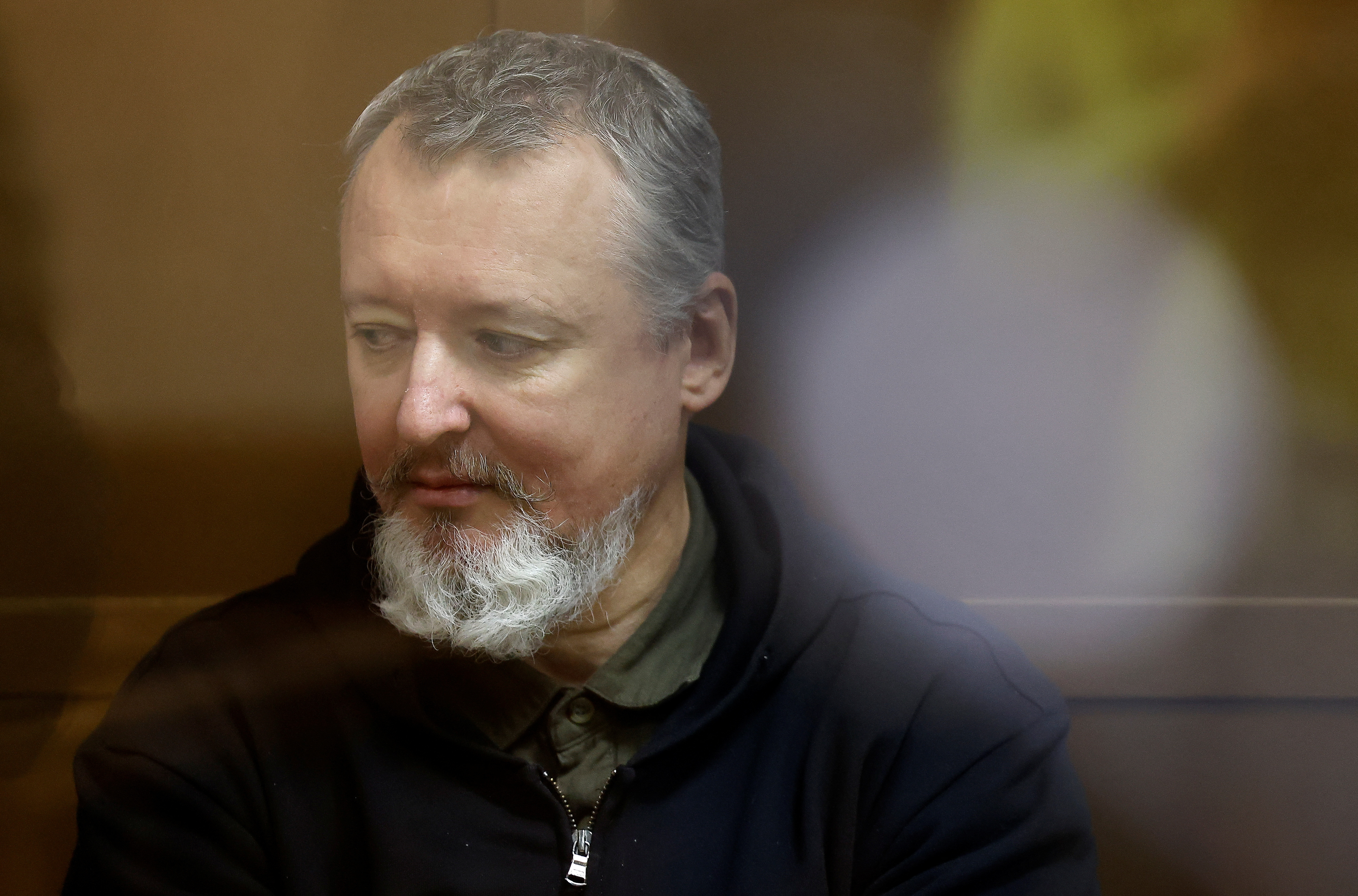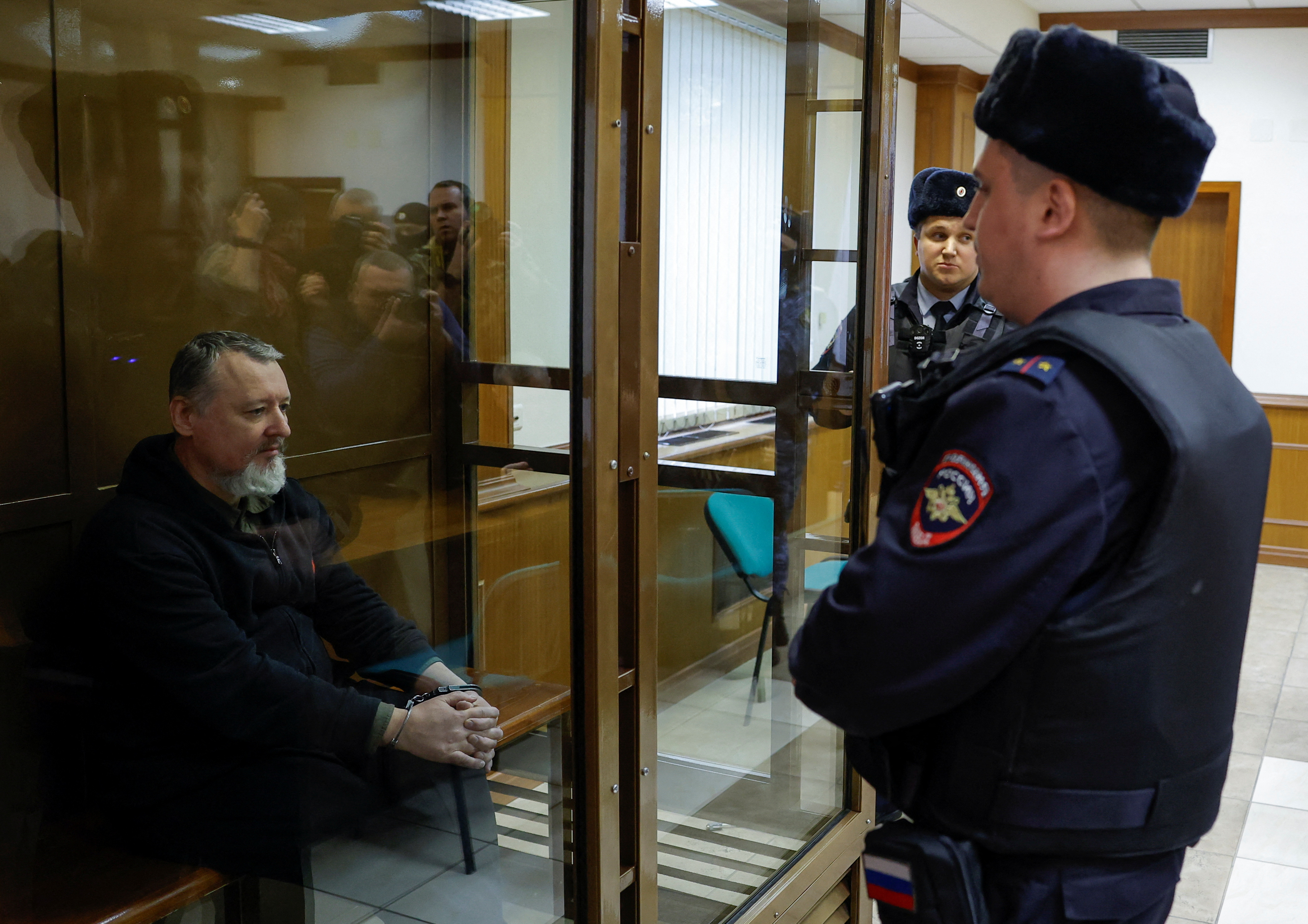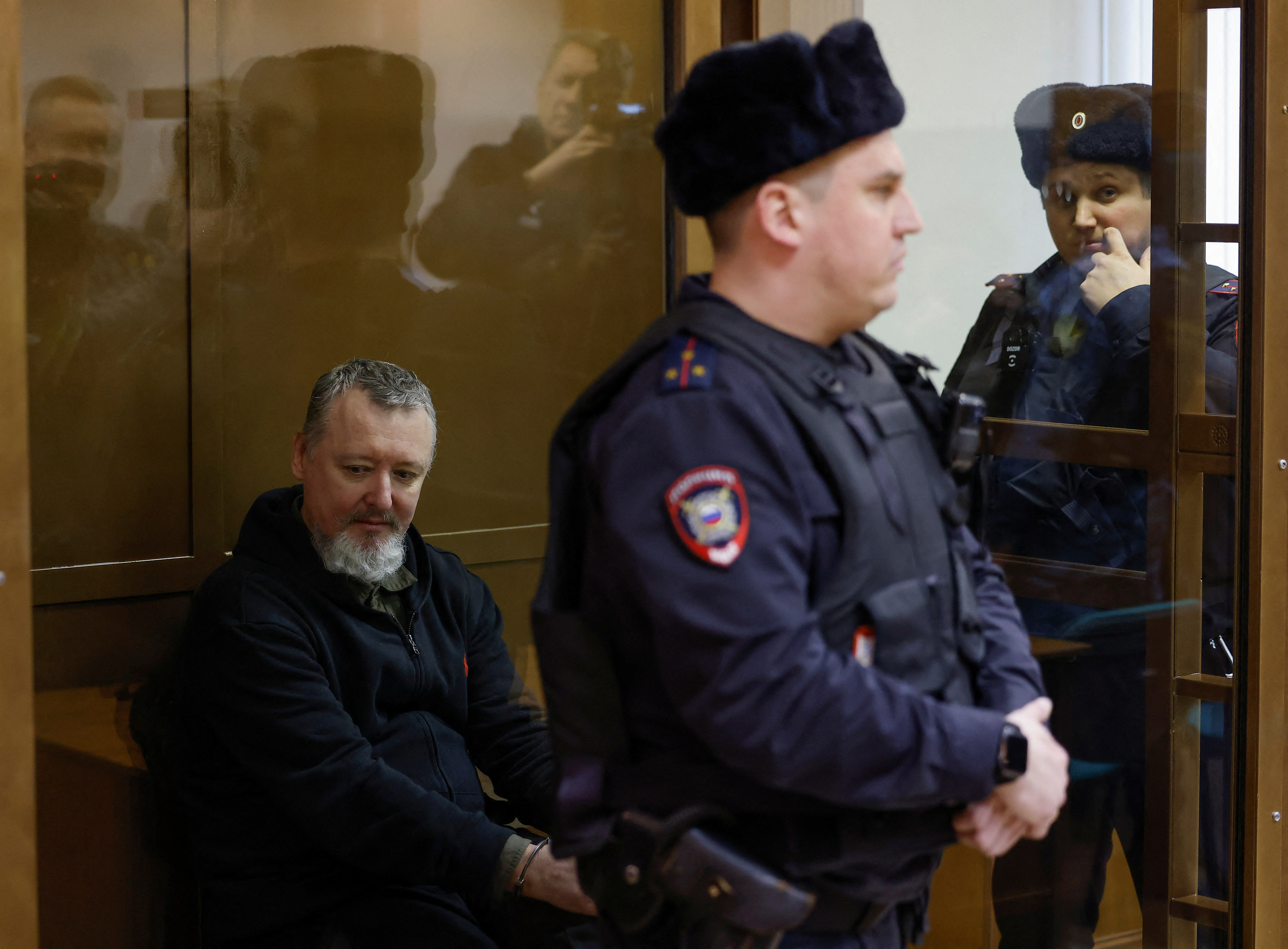 俄罗斯知名民族主义者、前军事指挥官和克里姆林宫批评者伊戈尔·吉尔金,也被称为伊戈尔·斯特列尔科夫,因被控煽动极端主义活动,坐在莫斯科一家法院审判前的被告围栏后面,2024年1月25日,俄罗斯。路透社/马克西姆… 阅读更多