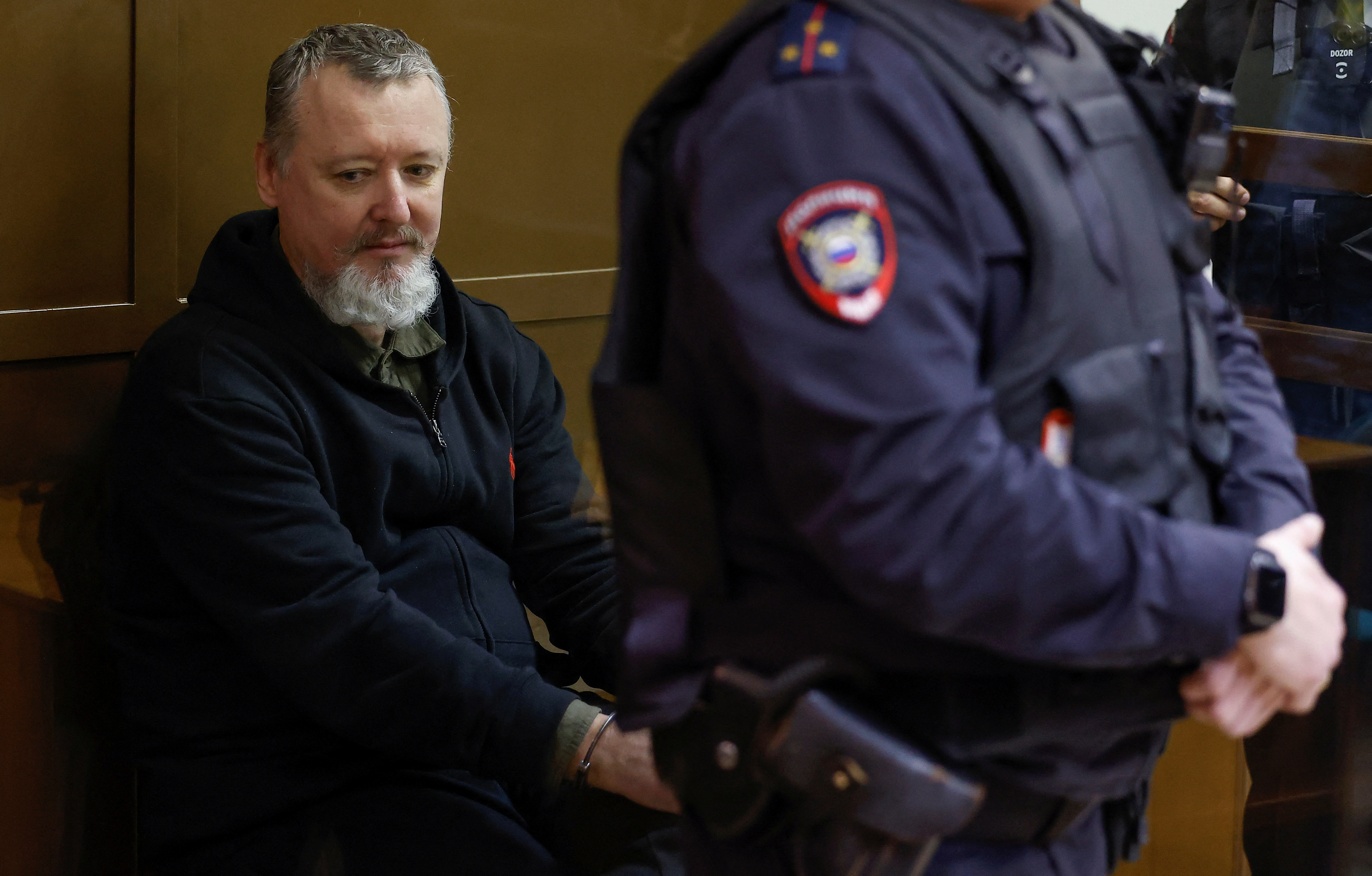 莫斯科,1月25日(路透社) - 俄罗斯知名民族主义者、前民兵指挥官伊戈尔·吉尔金指责总统弗拉基米尔·普京和军方高层在乌克兰战争中失败,周四在莫斯科一家法院被判煽动极端主义罪名成立,并被判四年监禁。战争。吉尔金否认了这一指控,他曾公开表示考虑在三月的总统选举中竞选,称自己能比俄罗斯资深领导人做得更好。吉尔金在听到判决时站在玻璃围栏内的法庭笼子里,他在十年前乌克兰东部战斗期间使用的化名伊戈尔·斯特列尔科夫,当法官宣布他被判有罪并将在监狱中度过四年时,他点了点头,翻了翻白眼。