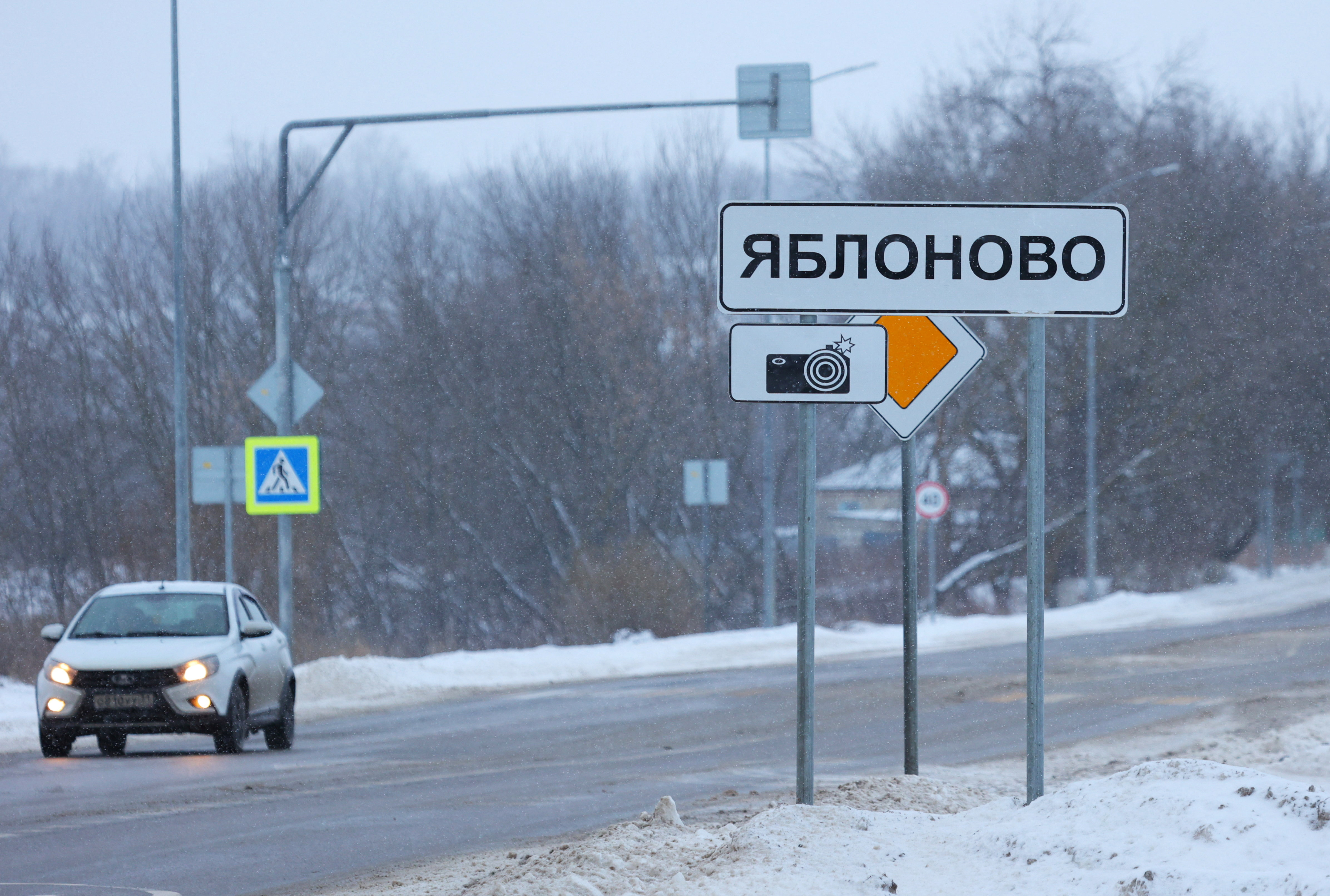 一张显示俄罗斯别尔哥罗德地区雅布洛诺沃村附近俄罗斯伊尔-76军用运输机坠毁现场的路标。2024年1月24日拍摄。REUTERS/Stringer
