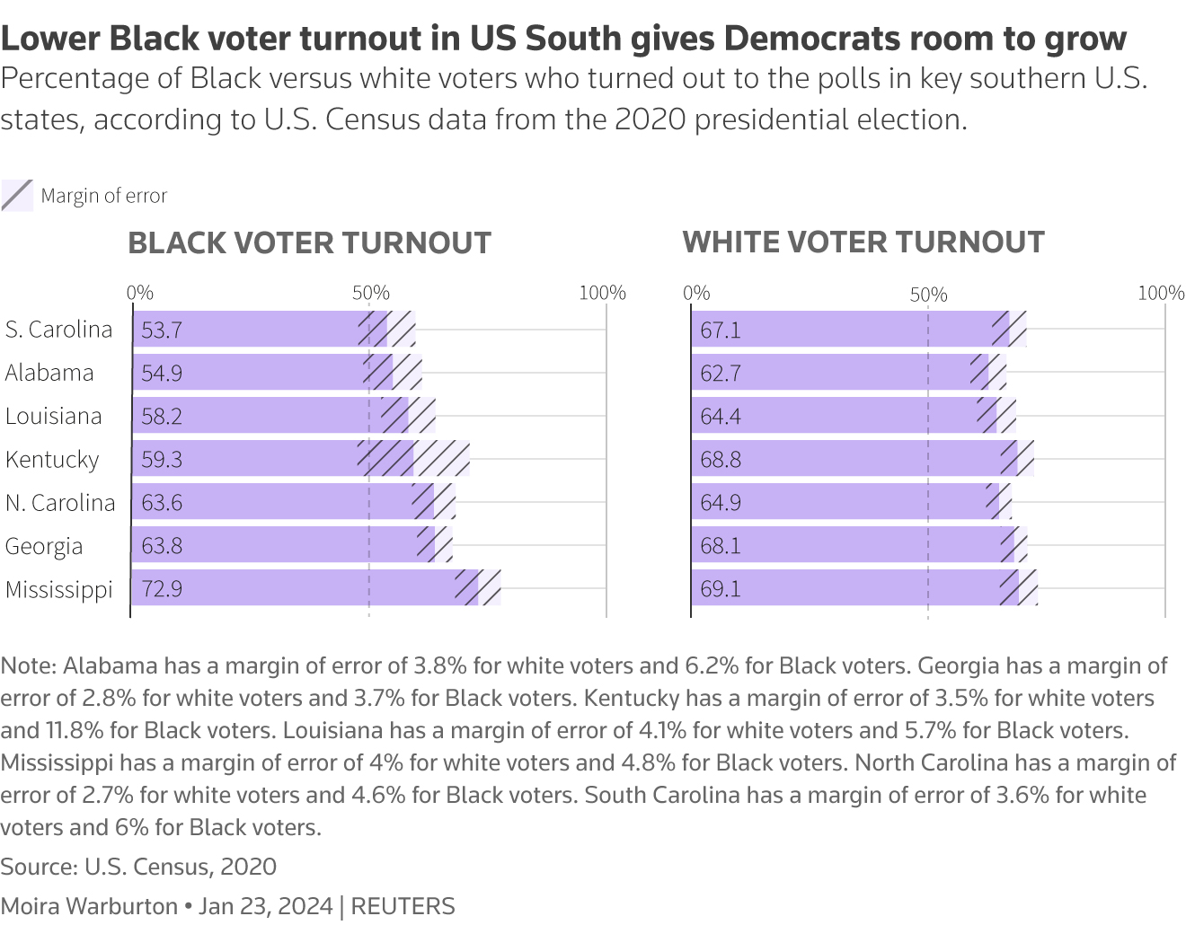 南卡罗来纳州哥伦比亚,1月26日(路透社) - 民主党在11月份没有赢得南卡罗来纳的机会,但这个州对乔·拜登的连任至关重要。民主党希望南卡罗来纳的新角色作为主办方党内首次正式初选将增强黑人选民的支持。党的高层也将其视为一个大胆新战略的跳板:在未来几年重新夺回美国南部。自1960年代民权运动以来,民主党在南部一直难以赢得选举。但是最近几年来该地区的移民激增以及在一系列州级选举中的胜利,包括在肯塔基州和北卡罗来纳州,以及拜登在2020年在佐治亚州险胜,使人们对其有望在11月的大选中取得进展充满了希望。尽管他的民意调查数字在全国范围内不佳,但民主党希望拜登今年能够扭转北卡罗来纳州的局势,这个州自1980年以来只有一次支持民主党总统候选人,并且该党还希望能够赢回南部几个关键的国会选区。从长远来看,他们把目光投向了路易斯安那州和密西西比州的州长和参议员竞选。