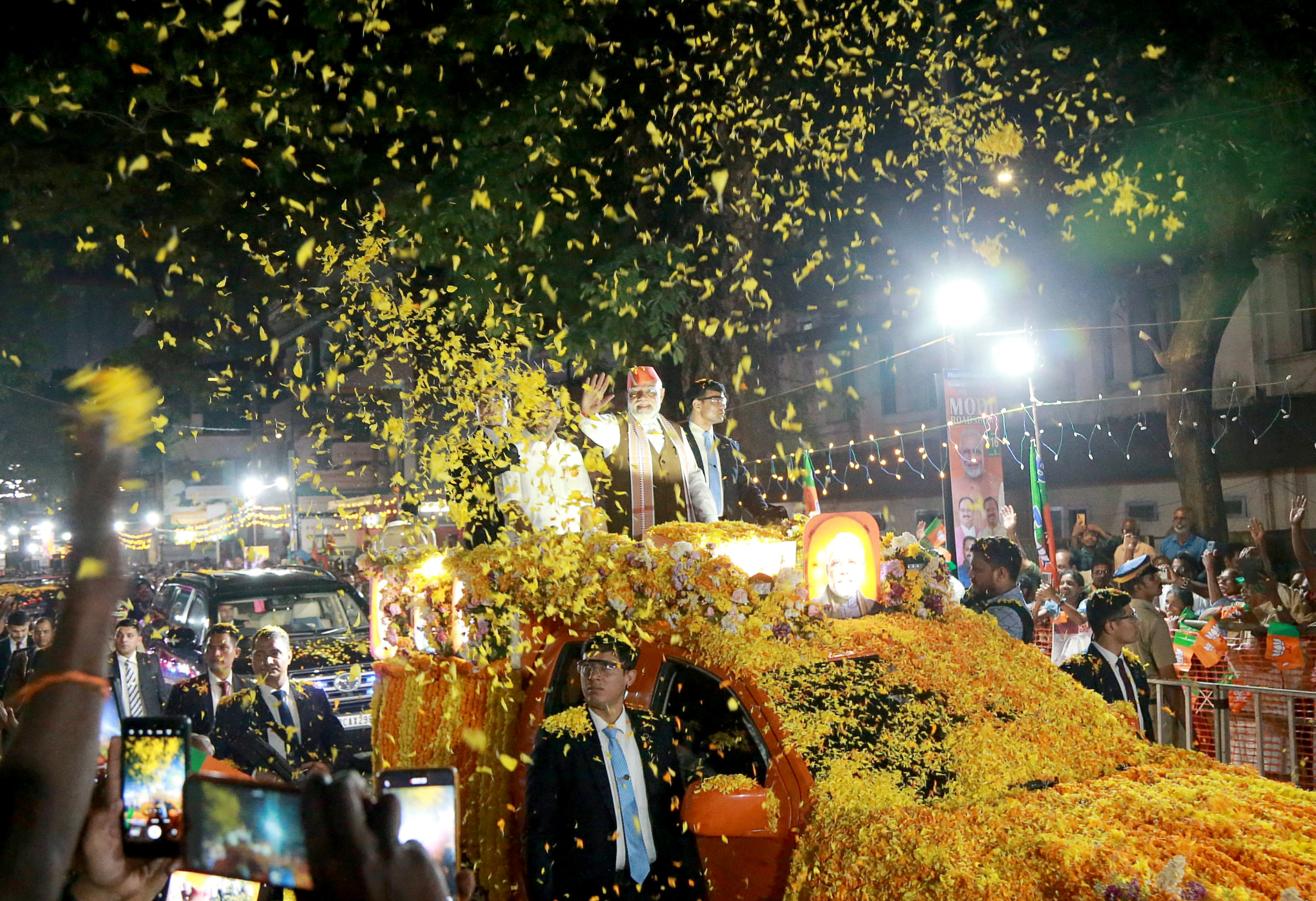 印度总理纳伦德拉·莫迪在2024年1月16日在印度科钦举行的巡回演出中向支持者挥手,他们向他撒花瓣。路透社/Sivaram V/文件照片